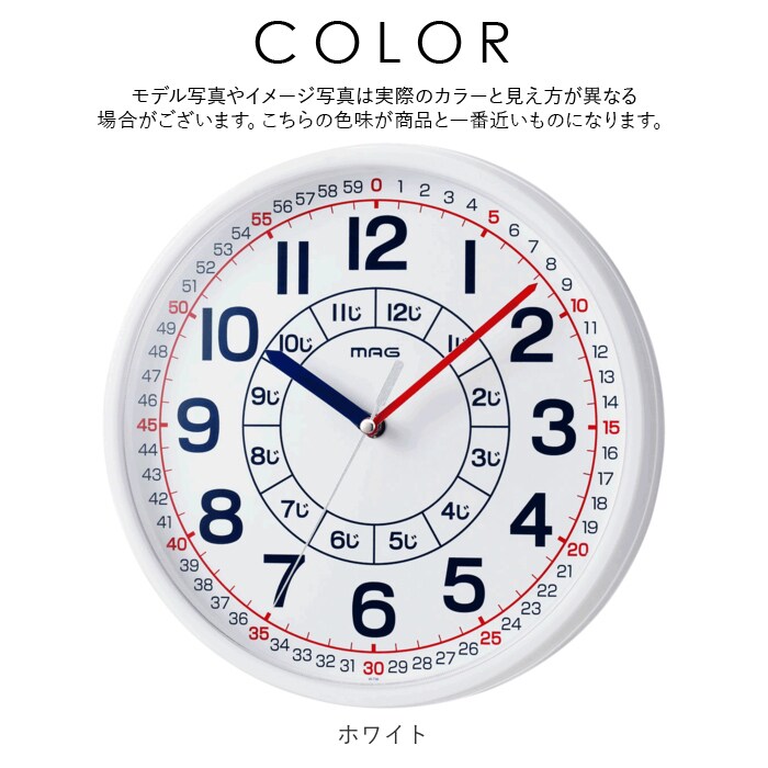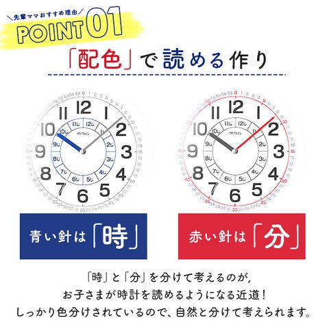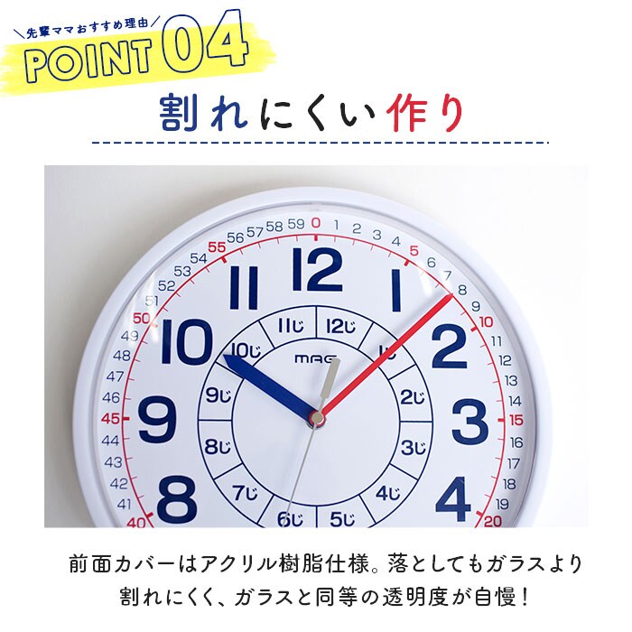 | 商品説明 | お子さんの「はじめてのとけい」にぴったり!時間が読みやすい工夫がいっぱいの知育時計よ~める!通常の掛け時計としても使えるように、シンプルな配色を採用。コントラストがハッキリしているので文字が見やすい!前面カバーはアクリル樹脂仕様。落としてもガラスより割れにくく、ガラスと同等の透明度が自慢★一番内側で「時」が、一番外側で「分」と「秒」がわかるようになっているから、お子さんがつまづきやすい時計の読み方も一目瞭然♪とけいの読み方、教え方のコツがわかるアドバイスシート付きで、おうちで気軽にレッスン開始★ |
