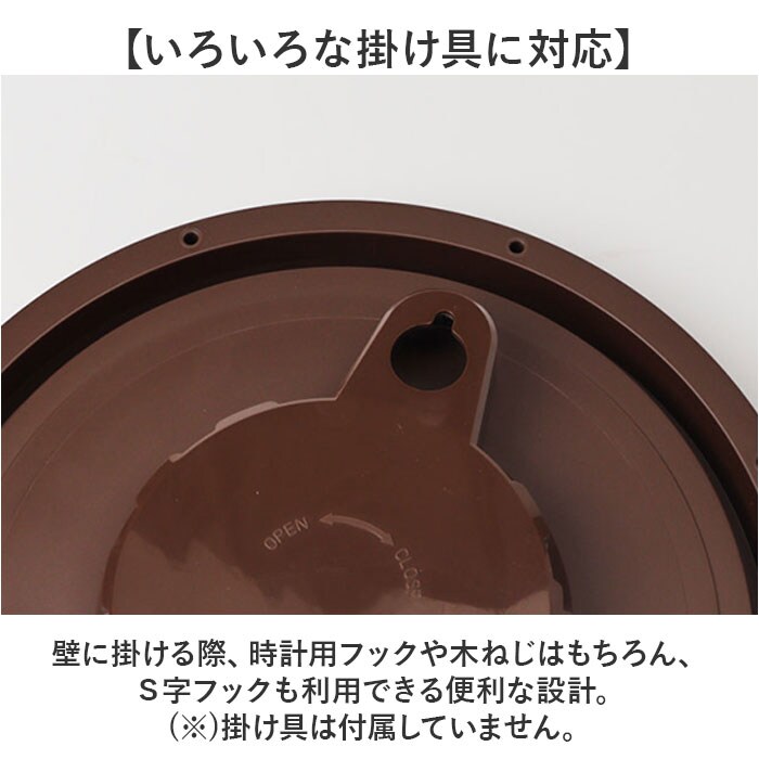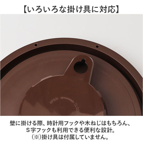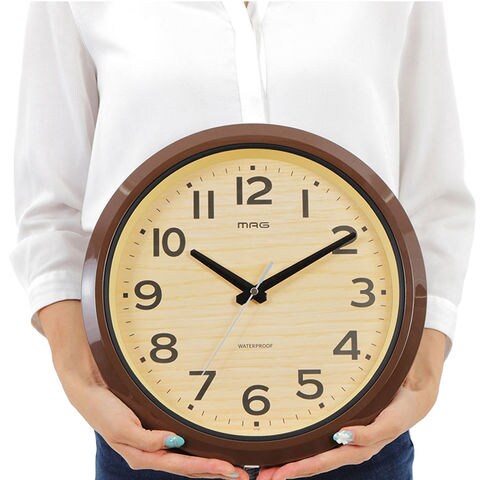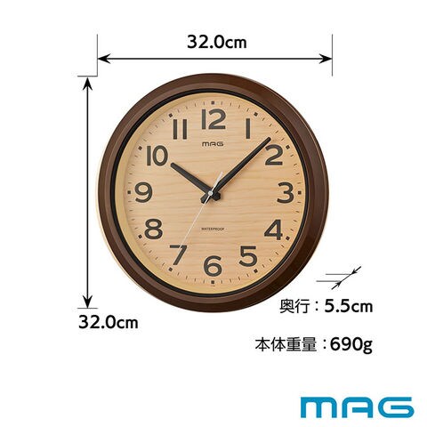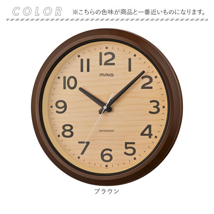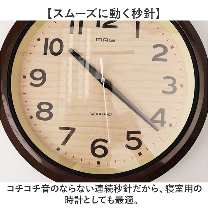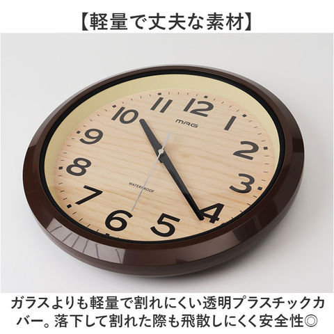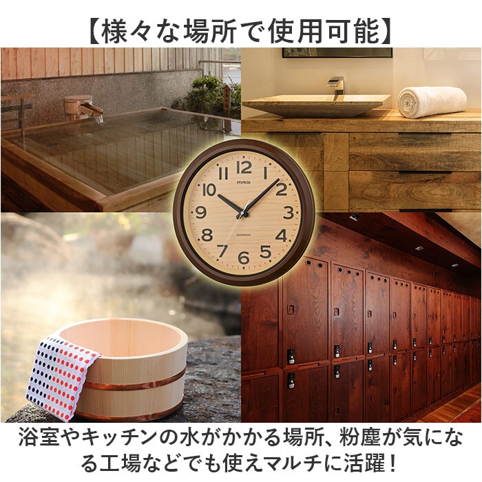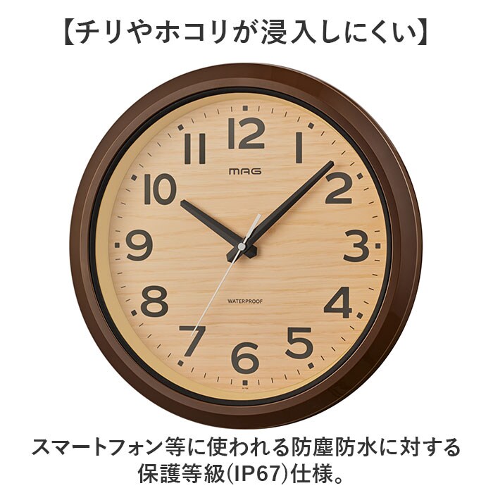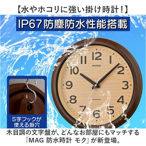 商品説明【水やホコリに強い掛け時計!】木目調の文字盤が、どんなお部屋にもマッチする「MAG 防水時計 モク」が新登場。【チリやホコリが浸入しにくい】スマートフォン等に使われる防塵防水に対する保護等級(IP67)仕様。【軽量で丈夫な素材】ガラスよりも軽量で割れにくい透明プラスチックカバー。落下して割れた際も飛散しにくく安全性◎【見やすい文字盤】離れた場所からも見やすいよう視認性に優れた丸みのある柔らかいフォントを配置。【スムーズに動く秒針】コチコチ音のならない連続秒針だから、寝室用の時計としても最適。【いろいろな掛け具に対応】壁に掛ける際、時計用フックや木ねじはもちろん、S字フックも利用できる便利な設計。(※)掛け具は付属していません。【様々な場所で使用可能】浴室やキッチンの水がかかる場所、粉塵が気になる工場などでも使えマルチに活躍!【電池仕様】※単3形乾電池1本使用。(電池は別売りです。)