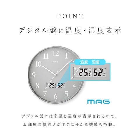 | 商品説明 | 【オシャレで機能性もばっちり】スモーキーカラーがインテリアと調和♪機能性もあるアナログ掛け時計が登場。【時刻を正確に刻む電波時計】時間が狂いにくい電波時計タイプ。ズレを自動的に修正してくれて、正確な時間を確認できる。【夜間は静かな秒針停止機能】夜の10時から朝の6時までは秒針がストップする機能を搭載。寝室で使っても安心な設計。【お部屋の快適さが分かる】デジタル盤には室温と湿度が表示されるので、お部屋の快適さがすぐに分かる機能も搭載。【どこにでも掛けられる】コードレスで使える電池タイプで掛ける場所を選ばないのもポイント。※【大きく見やすい】文字盤は装飾がなく、大きな数字が描かれているので時間を確認しやすい。【インテリアを選ばない】シンプルなデザインとスモーキーカラーでインテリアを選ばず使える見た目◎【注意事項】※単三乾電池×2使用(電池別売り) |