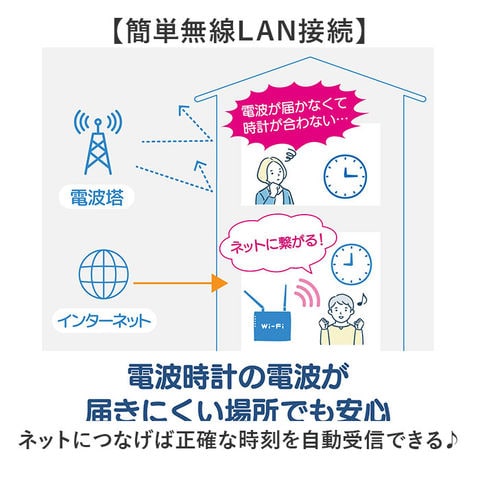 | 商品説明 | 【ネット接続で時刻を同期】電波の届かない場所でも安心、無線LAN接続で時刻を自動受信する掛け時計。【簡単無線LAN接続】ネットにつなげば正確な時刻を自動受信できる♪【アプリ不要の簡単設定】専用アプリをダウンロードする必要がなく、シンプルな操作だけで無線LANに接続できる◎【なめらか連続秒針】カチカチ音がしない連続秒針タイプで、静かな空間でも気にならない〇【木目調デザイン】どんなお部屋にも馴染みやすくインテリアとしても優秀。【軽量で設置ラクラク】壁への取り付けも簡単で場所を選ばずに設置!※必ず別売りのアルカリ乾電池をご使用下さい。 |
