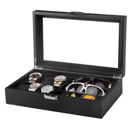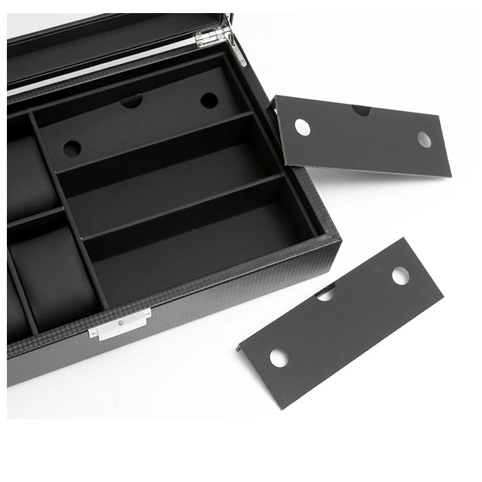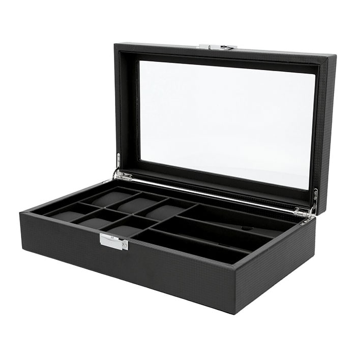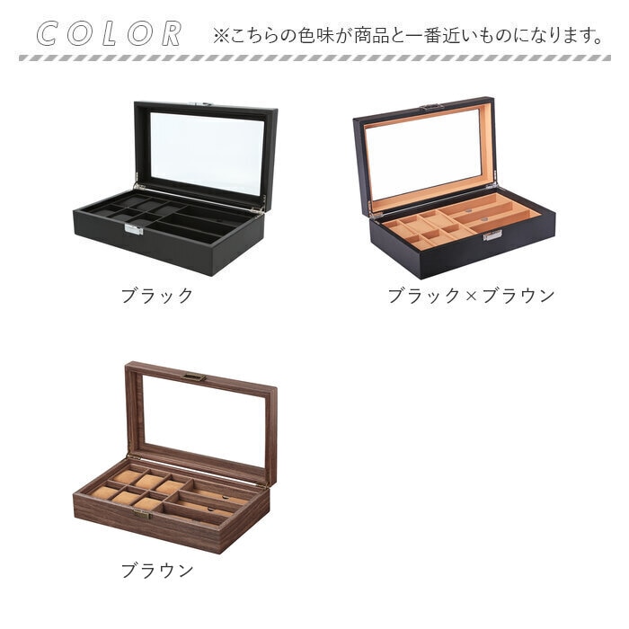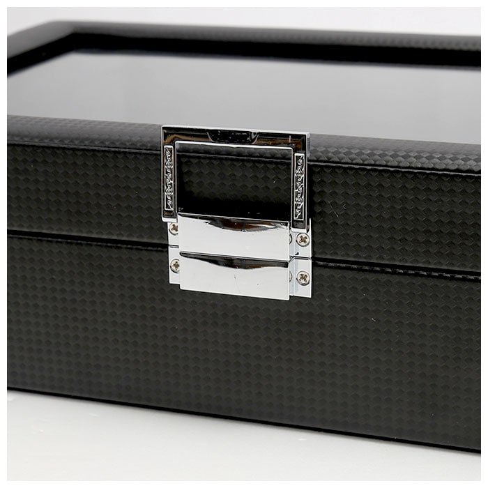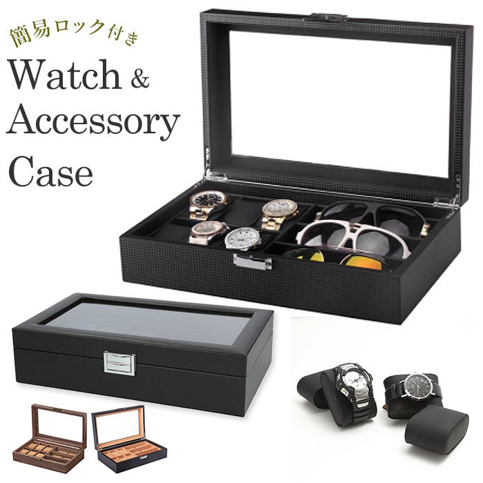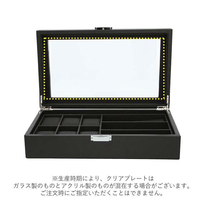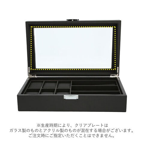 | 商品説明 | シックな外観が時計の魅力をより引き立てる!大切な腕時計をホコリや汚れから守ってくれる、ウォッチ&アクセサリーケースが新登場。ボックスケースの表地は、全面をカーボンファイバーレザーで加工したスタイリッシュなデザイン。上品な光沢が時計やアクセサリーのラグジュアリー感を演出。天板にはボックス内部が見渡せるクリアプレート素材を採用し、お気に入りの時計を見せるインテリアに!ソーラー式腕時計も充電が切れる心配がなく安心。(※生産時期により、クリアプレートはガラス製のものとアクリル製のものが混在していることがございます。ご注文時にご指定いただくことはできません。)ケース内左側には6つに区切られた腕時計用スペースを配置。右側にはサングラス大に仕切られたアクセサリー用のスペースを3ヶ所設け、ネックレスやブレスレットなどお気に入りの品がまとめて保管できる。腕時計用スペースには、ふんわり柔らかなPUレザークッションを使用。腕時計をキズや衝撃から守り、安全に保管できる。(※保管する腕時計は、フェイスサイズ45mm以下を推奨します。クッション周りの寸法が約18cmのため、腕回り18cm以下の腕時計はバンドをクッションに留めた状態での収納ができない場合がございます。)ケース開閉部分は簡易ロック付きなので、お子さまやペットのいるご家庭でも安心して使用可能。時計を愛するすべての方にお勧めの逸品。 |