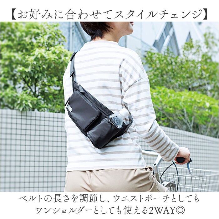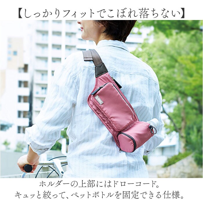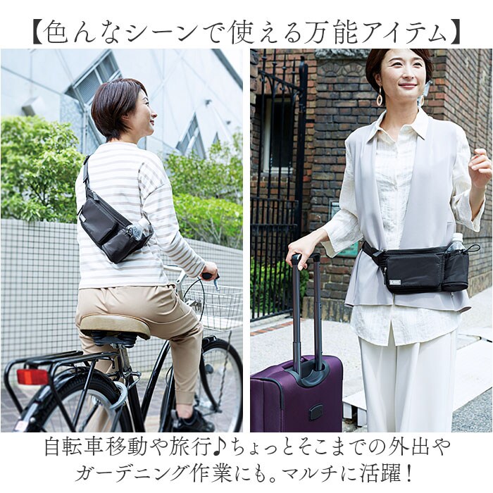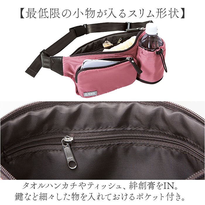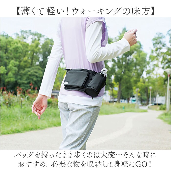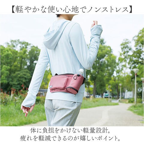 | 商品説明 | 【手ぶらでラクチン♪ウォーキング】ウォーキングの必需品をまとめて、軽快に歩ける!「体にフィット 軽量ウォークバッグ」。【薄くて軽い!ウォーキングの味方】バッグを持ったまま歩くのは大変…そんな時におすすめ。必要な物を収納して身軽にGO!【お好みに合わせてスタイルチェンジ】ベルトの長さを調節し、ウエストポーチとしてもワンショルダーとしても使える2WAY◎【ワンタッチ着脱できるバックル式】ベルトはバックルで簡単着脱。いつでもサクッと身につけて、すぐに外せる!【開閉スムーズ、安心のファスナー式】ガバっと開いて取り出しやすく、ファスナーを閉じれば中身の飛び出しをガード。【最低限の小物が入るスリム形状】タオルハンカチやティッシュ、絆創膏をIN。鍵など細々した物を入れておけるポケット付き。【大小対応の伸縮ドリンクホルダー】ファスナーを開閉することで、高さが伸縮。そのままで350ml、伸ばせば500mlを収納。【しっかりフィットでこぼれ落ちない】ホルダーの上部にはドローコード。キュッと絞って、ペットボトルを固定できる仕様。【スマホをサッと取り出せるポケット】出し入れしやすいL字型ファスナー式。ウォーキング中もスムーズに取り出せて便利。【ムレを軽減&快適なフィット感】肌に当たる背面部分は、汗をかいてもムレにくいメッシュ仕様。ソフトで心地よい肌当たり。【軽やかな使い心地でノンストレス】体に負担をかけない軽量設計。疲れを軽減できるのが嬉しいポイント。【暗闇での視認性をアップ】フロントロゴは、暗闇でヘッドライトの光を反射するリフレクター。夜間や視界の悪い日にも。【不意の雨に対応&いつも清潔キープ】表地のみ、撥水加工&抗菌防臭加工済み。水滴や汚れを弾き、ガシガシ使っても衛生的。(※1)撥水加工を施しておりますが、完全防水ではありません。【色んなシーンで使える万能アイテム】自転車移動や旅行♪ちょっとそこまでの外出やガーデニング作業にも。マルチに活躍! |