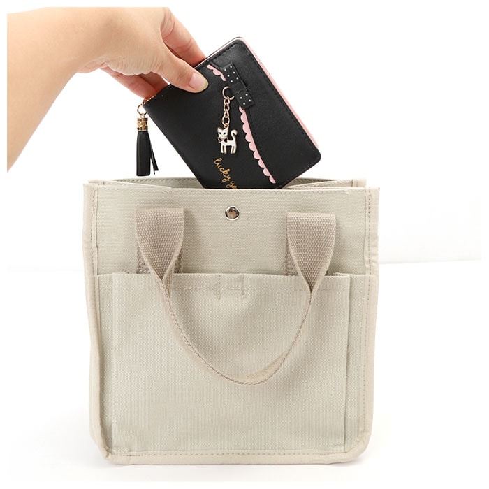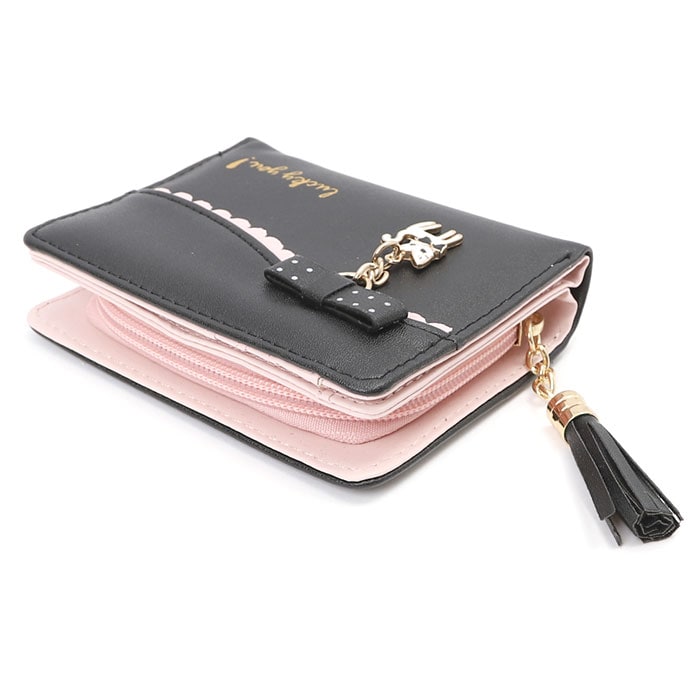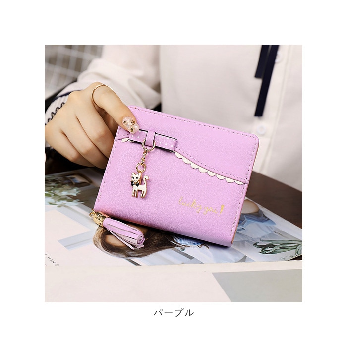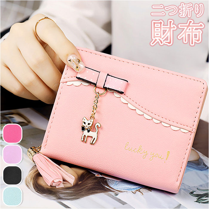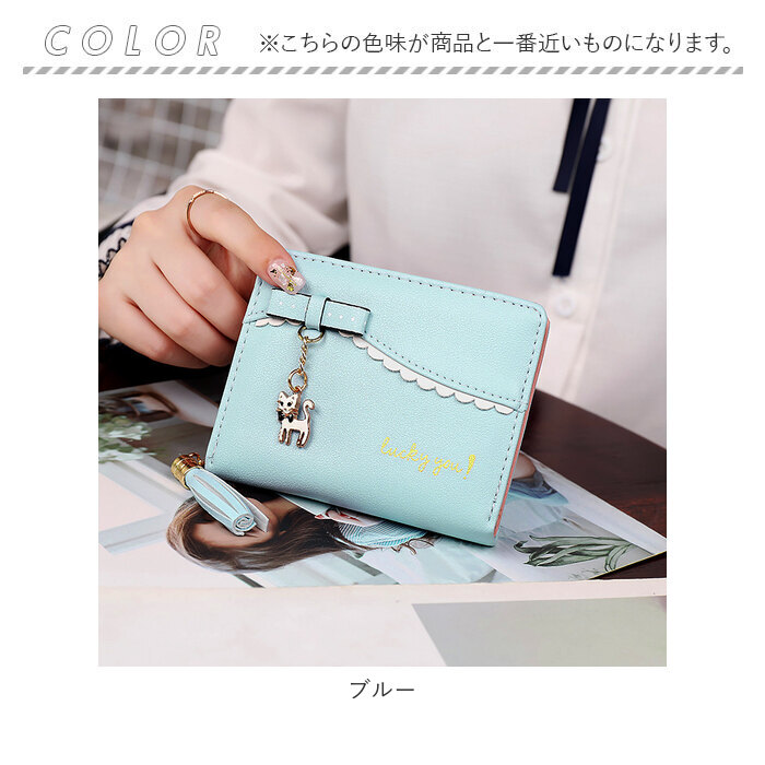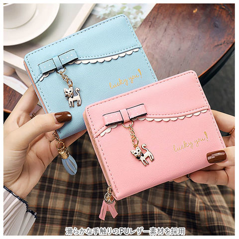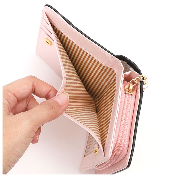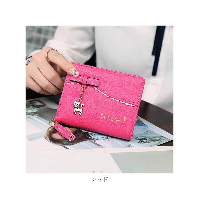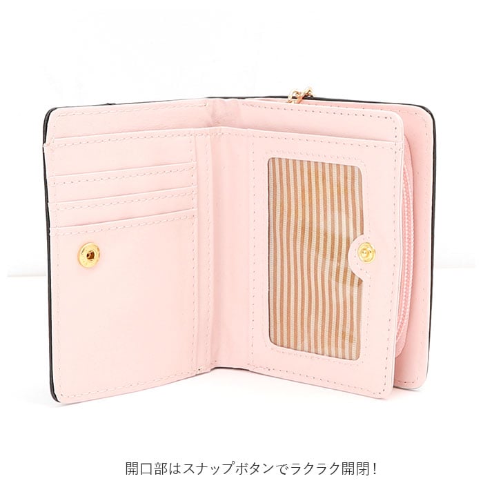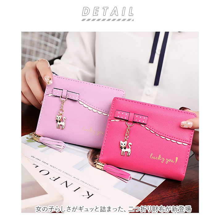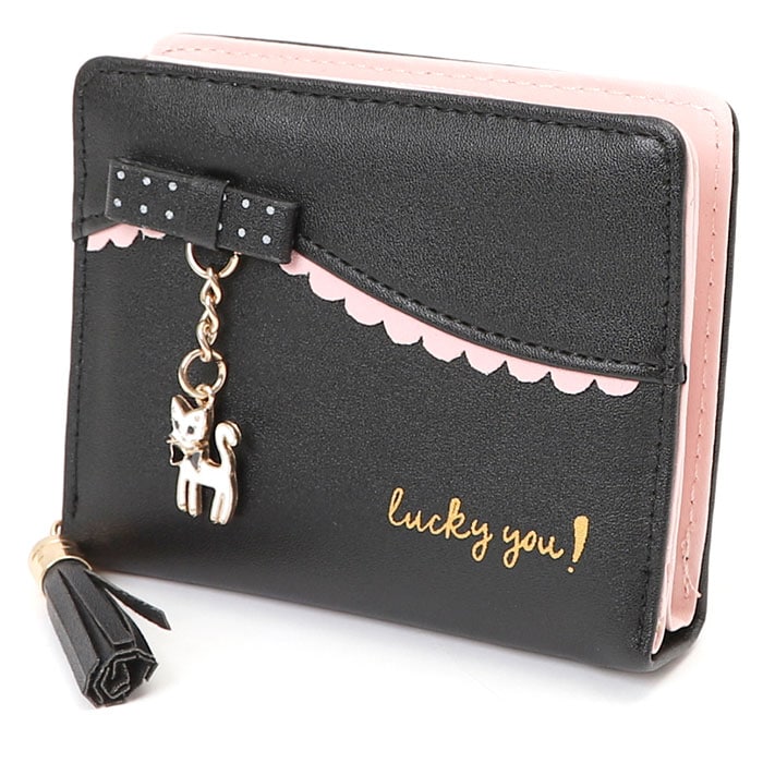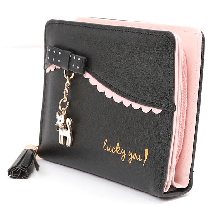 | 商品説明 | 女の子らしさがギュッと詰まった、二つ折り財布が新登場。リボンやレースデザイン、猫のチャームがポイント♪滑らかな手触りのPUレザー素材を採用。ミニバッグにも収まるサイズ感。開口部はスナップボタンでラクラク開閉!内側にお札入れ×1、カードポケット×3、フリーポケット×2、クリア窓ポケット×1を装備。外側に配置された小銭入れは、横マチ付きの2ルーム仕様。側面まで大きく開くラウンドファスナー式で、小銭の出し入れがラクチン。タッセル付きのファスナー引き手もアクセントに。 |