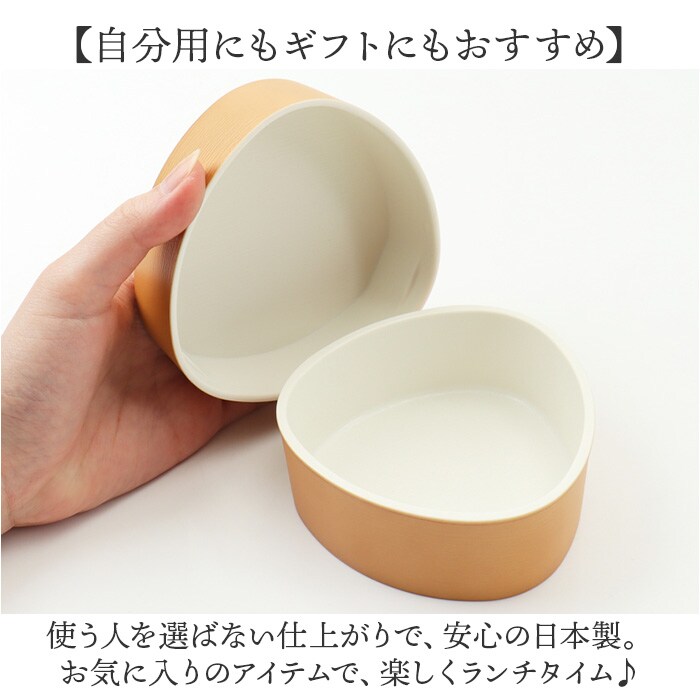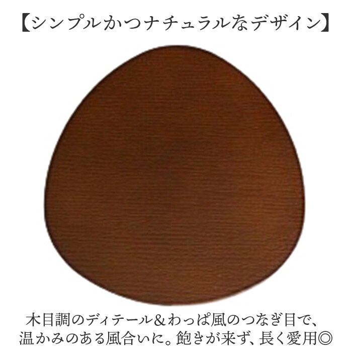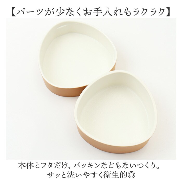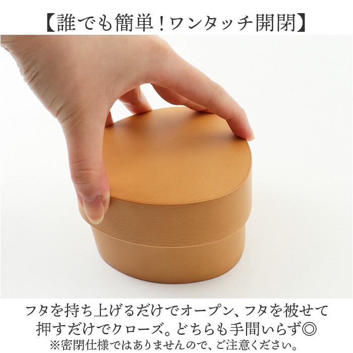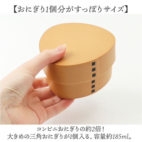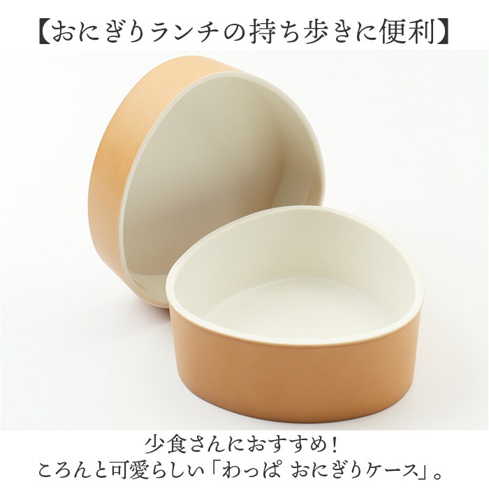 | 商品説明 | 【おにぎりランチの持ち歩きに便利】少食さんにおすすめ!ころんと可愛らしい「わっぱ おにぎりケース」。【誰でも簡単!ワンタッチ開閉】フタを持ち上げるだけでオープン、フタを被せて押すだけでクローズ。どちらも手間いらず◎(※)密閉仕様ではありませんので、ご注意ください。【おにぎり1個分がすっぽりサイズ】コンビニおにぎりの約2倍!大きめの三角おにぎりが1個入る、容量約185ml。【型崩れを防いで持ち運べる】そのままバッグインできる丈夫なハードケース。軽く握ったふんわりおにぎりも、形をキープ。【パーツが少なくお手入れもラクラク】本体とフタだけ、パッキンなどもないつくり。サッと洗いやすく衛生的◎【シンプルかつナチュラルなデザイン】木目調のディテール&わっぱ風のつなぎ目で、温かみのある風合いに。飽きが来ず、長く愛用◎【自分用にもギフトにもおすすめ】使う人を選ばない仕上がりで、安心の日本製。お気に入りのアイテムで、楽しくランチタイム♪ |