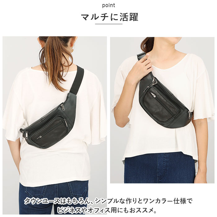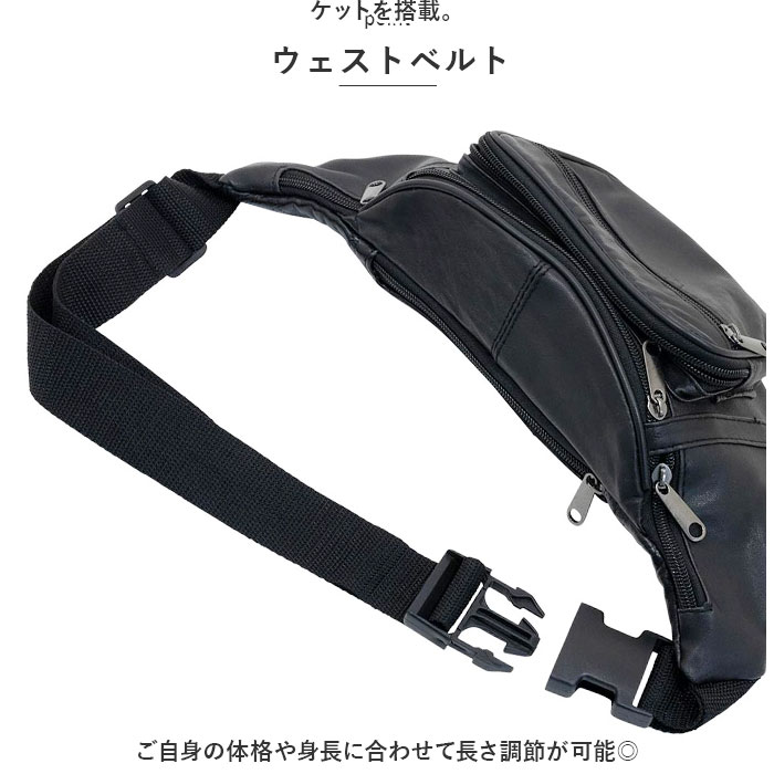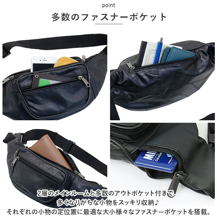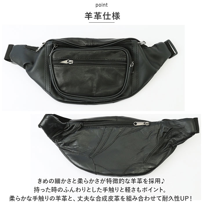 | 商品説明 | 柔らかレザーの定番「羊革」使ったウェストバッグが新発売♪【羊革仕様】きめの細かさと柔らかさが特徴的な羊革を採用♪持った時のふんわりとした手触りと軽さもポイント。柔らかな手触りの羊革と、丈夫な合成皮革を組み合わせて耐久性UP!【多数のファスナーポケット】・2層のメインルームと多数のアウトポケット付きで、多くなりがちな小物をスッキリ収納♪それぞれの小物の定位置に最適な大小様々なファスナーポケットを搭載。【ウェストベルト】ご自身の体格や身長に合わせて長さ調節が可能◎【マルチに活躍】タウンユースはもちろん、シンプルな作りとワンカラー仕様でビジネスやオフィス用にもおススメ。【ポケット仕様】メインルーム・・・2層両サイド・・・ファスナーポケット×2フロント・・・ファスナーポケット×2 |