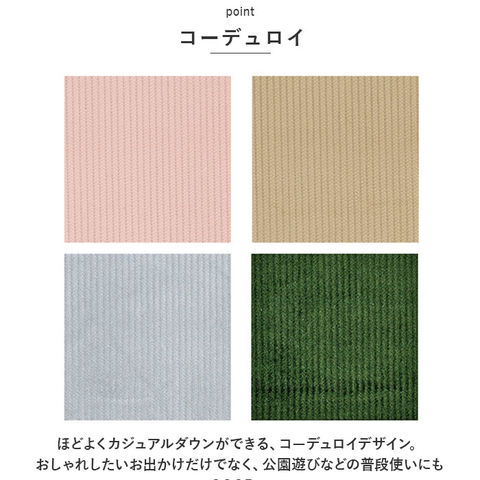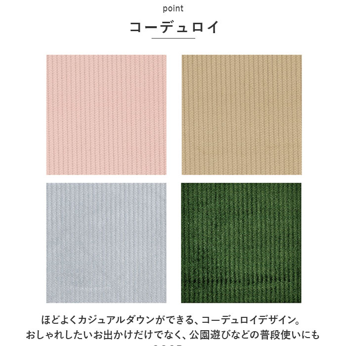| 素材 | [コーデュロイ]綿100% [ボア]ポリエステル100% [裏地]綿100%(オーガニック) |