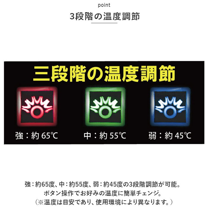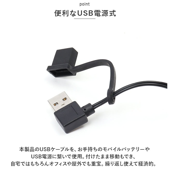 | 商品説明 | 首や肩の冷えに。いつでもどこでも使えて、上半身から温める「ぽかぽかネックヒーター」が新登場。【便利なUSB電源式】本製品のUSBケーブルを、お手持ちのモバイルバッテリーやUSB電源に繋いで使用。付けたまま移動もでき、自宅ではもちろんオフィスや屋外でも重宝。繰り返し使えて経済的。【ワンタッチ装着】着脱しやすい面ファスナー式。長さ調節もしやすく、自分サイズにフィット。【ボタン1つで簡単操作】電源オンもオフも、ボタンを長押しするだけ。どなたでも簡単に操作できるのが嬉しい!【3段階の温度調節】強:約65度、中:約55度、弱:約45度の3段階調節が可能。ボタン操作でお好みの温度に簡単チェンジ。(※温度は目安であり、使用環境により異なります。)【あたたかさをキープ】加熱時間の目安は強:6時間、中:8時間、弱:10時間。(※モバイルバッテリー10000mAh使用時の目安です。)【付け心地快適】首元に当たる部分は、通気性に優れたメッシュ生地を使用。ムレにくく快適。【お手入れラクラク】汚れが気になったら、自宅で手洗い可能。いつも清潔をキープ。(※洗濯時はバッテリーを外し、USBコネクト部分を濡らさないようにしてください。)【冬のお助けアイテム】お手持ちのマフラーと合わせれば、さらにぽかぽか♪マフラーを被せれば、移動中もネックヒーターを見せることなく防寒対策! |