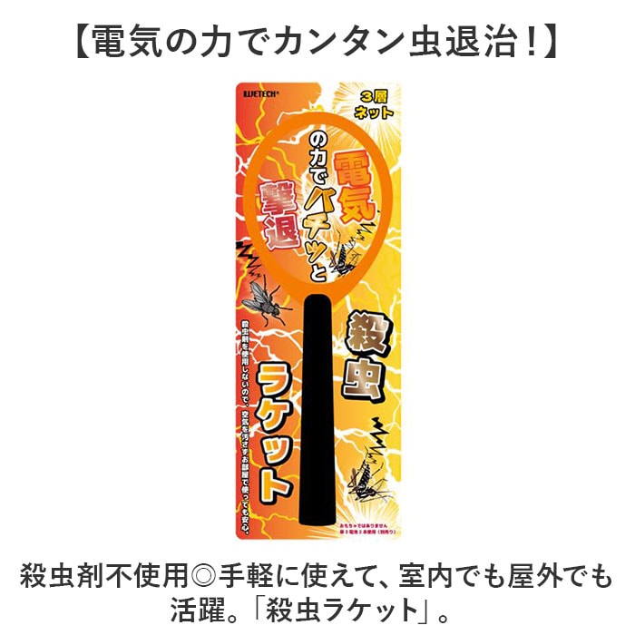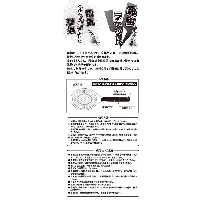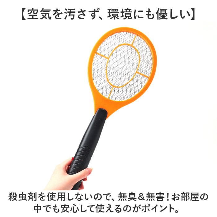 | 商品説明 | 【電気の力でカンタン虫退治!】殺虫剤不使用◎手軽に使えて、室内でも屋外でも活躍。「殺虫ラケット」。【電撃殺虫できるラケットタイプ】テニスラケットのような形状。金属ネットに一定の電流を流し、接触した蚊やハエを駆除。(※)別売りの単3電池2本使用。通電中は金属ネットに触れないでください。【空気を汚さず、環境にも優しい】殺虫剤を使用しないので、無臭&無害!お部屋の中でも安心して使えるのがポイント。【レジャーやアウトドアでも重宝】殺虫剤や蚊取器の効果が薄い屋外でも、自分で狙った虫をサッと叩くだけ。【家庭にひとつあると便利なアイテム】日々の生活の中での虫対策に。虫が苦手な方にとっても、お助けアイテム! |