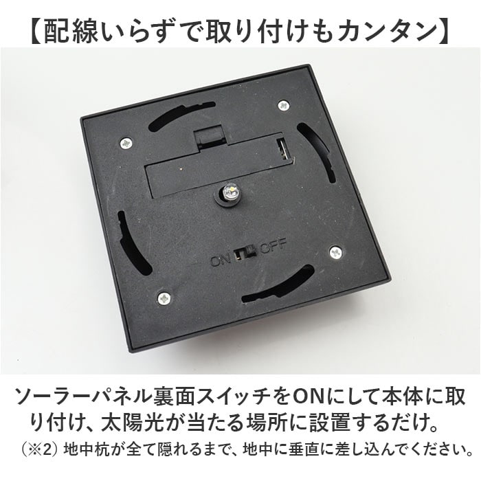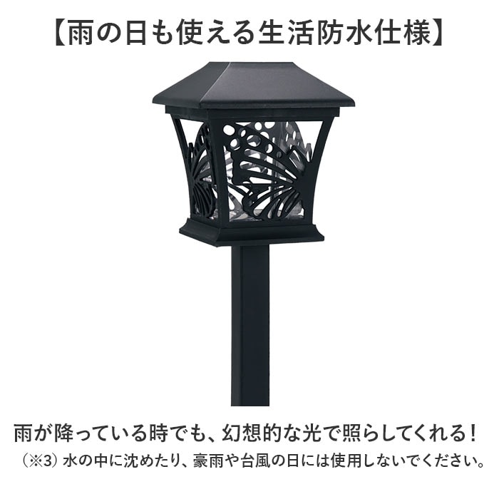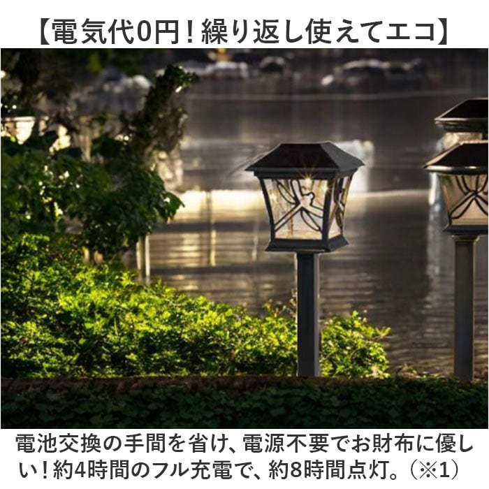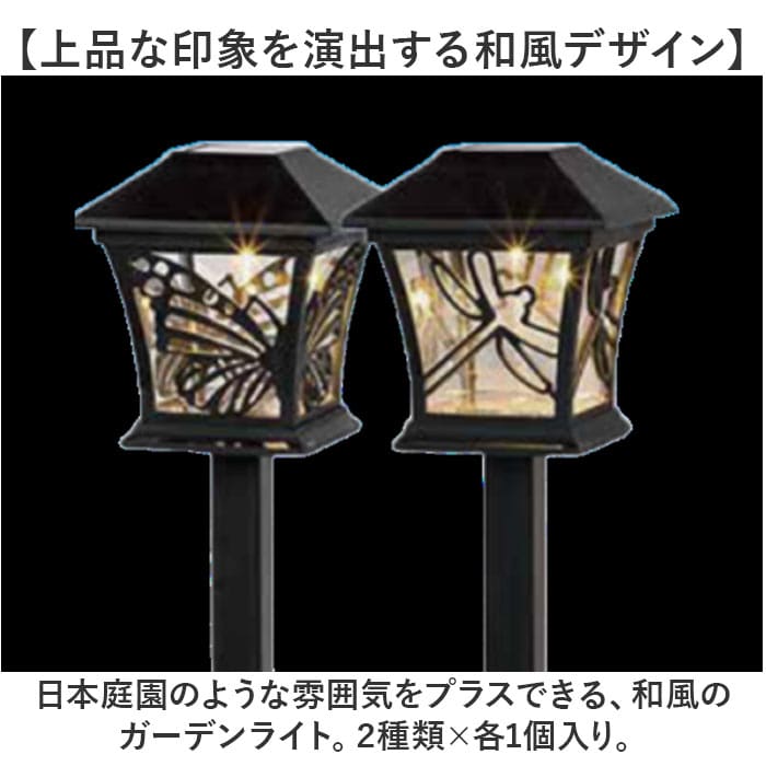 | 商品説明 | 【簡単に設置できて美しい外観に】お庭を優しい光でおしゃれに彩る♪埋め込み式の「ソーラーガーデンライト 和風」。【周囲が暗くなると自動で点灯】ソーラーパネルに太陽光を当てるだけで日中に充電、暗くなると自動点灯するソーラー充電式◎【電気代0円!繰り返し使えてエコ】電池交換の手間を省け、電源不要でお財布に優しい!約4時間のフル充電で、約8時間点灯。(※1)充電時間、点灯時間は目安です。設置場所や移転工、気温などにより変動する場合があります。【配線いらずで取り付けもカンタン】ソーラーパネル裏面スイッチをONにして本体に取り付け、太陽光が当たる場所に設置するだけ。(※2)地中杭が全て隠れるまで、地中に垂直に差し込んでください。【雨の日も使える生活防水仕様】雨が降っている時でも、幻想的な光で照らしてくれる!(※3)水の中に沈めたり、豪雨や台風の日には使用しないでください。【上品な印象を演出する和風デザイン】日本庭園のような雰囲気をプラスできる、和風のガーデンライト。2種類×各1個入り。 |