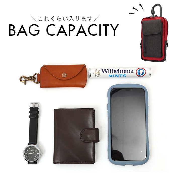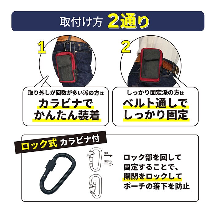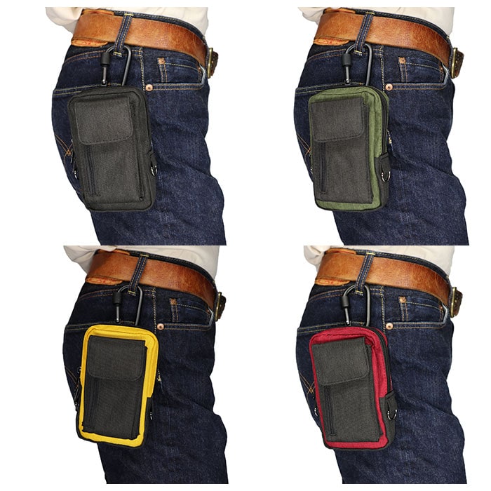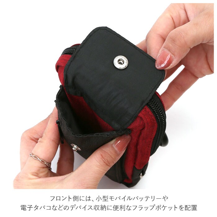 | 商品説明 | スマホもお仕事用ツールもこれ一つで!お洒落でコンパクトな「ワークポーチ(WK-02タイプ)」が新登場。ファスナー式のメイン収納ルームには、6.1インチまでのスマートフォンがジャストに収納可能。(※事前にお手持ちの機器のサイズをよくご確認の上、ご購入ください。)フロント側には、小型モバイルバッテリーや電子タバコなどのデバイス収納に便利なフラップポケットを配置。スナップ式フラップがツールのこぼれ落ちを防止するため、リップクリームやアトマイザーのような小物入れにも最適。最前面の縦型ファスナーは交通系ICカード入れにオススメ!ポーチ両サイドには鍵やお気に入りのチャームが取り付けられるDカン付き。ウエストにしっかり固定したい方は背面ベルトループで装着!頻繁にポーチを取り外す方には、ロック付きカラビナで簡単取り付けもできる2WAY仕様。(※カラビナはファッション用です。登山用のカラビナとしてはご使用いただけません。)色鮮やかな杢調ポリキャンバス生地に、ブラックのフロントポケットを合わせたスタイリッシュなバイカラー。ファッションにマッチするデザインがチョイスできる♪(※BLACKのみ単色カラーのデザインになります。) |