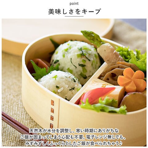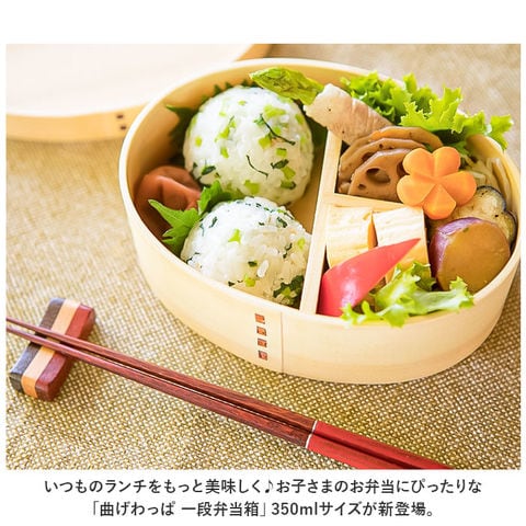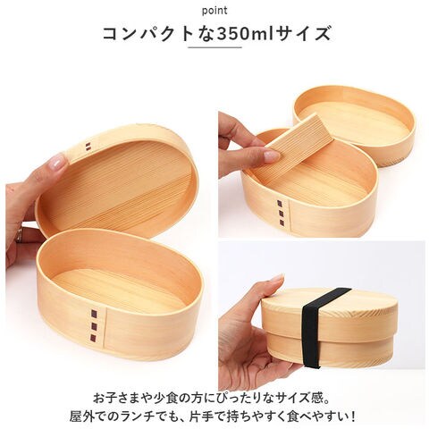 | 商品説明 | いつものランチをもっと美味しく♪お子さまのお弁当にぴったりな「曲げわっぱ 一段弁当箱」350mlサイズが新登場。【日本の伝統的な曲げわっぱ弁当箱】天然木を使用しており、木の調湿作用でご飯がベチャつかない!通気性が良く、梅雨の時期や夏場でもお弁当が傷みにくいのがポイント。【美味しさをキープ】天然木が水分を調整し、寒い時期にありがちなご飯が固まってしまう心配も不要。電子レンジ無しでも、みずみずしくふっくらとしたご飯が食べられちゃう♪【コンパクトな350mlサイズ】お子さまや少食の方にぴったりなサイズ感。屋外でのランチでも、片手で持ちやすく食べやすい!【キレイに盛り付け】おかずが片寄りにくい仕切り付き。お好みの位置にスライド調節できて、盛り付け悩みも軽減。【ゴムバンドが付属】お弁当箱をしっかりホールドできて、持ち運び時も安心。【選べるカラー】表情の異なる2カラーをご用意。家族色違いで揃えるのもおすすめ。(※天然素材を使用しているため、サイズや重さには個体差があります。) |