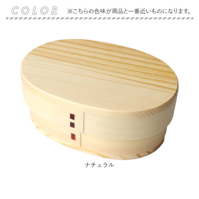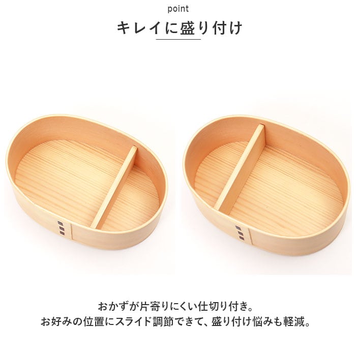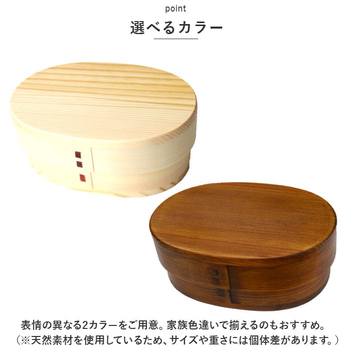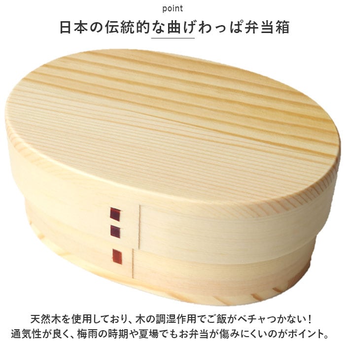 | 商品説明 | いつものランチをもっと美味しく♪お子さまのお弁当にぴったりな「曲げわっぱ 一段弁当箱」350mlサイズが新登場。【日本の伝統的な曲げわっぱ弁当箱】天然木を使用しており、木の調湿作用でご飯がベチャつかない!通気性が良く、梅雨の時期や夏場でもお弁当が傷みにくいのがポイント。【美味しさをキープ】天然木が水分を調整し、寒い時期にありがちなご飯が固まってしまう心配も不要。電子レンジ無しでも、みずみずしくふっくらとしたご飯が食べられちゃう♪【コンパクトな350mlサイズ】お子さまや少食の方にぴったりなサイズ感。屋外でのランチでも、片手で持ちやすく食べやすい!【キレイに盛り付け】おかずが片寄りにくい仕切り付き。お好みの位置にスライド調節できて、盛り付け悩みも軽減。【ゴムバンドが付属】お弁当箱をしっかりホールドできて、持ち運び時も安心。【選べるカラー】表情の異なる2カラーをご用意。家族色違いで揃えるのもおすすめ。(※天然素材を使用しているため、サイズや重さには個体差があります。) |