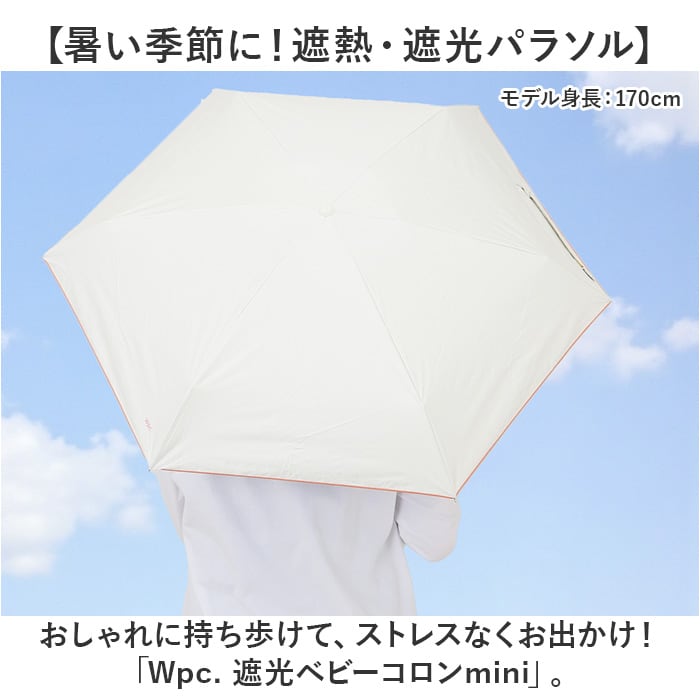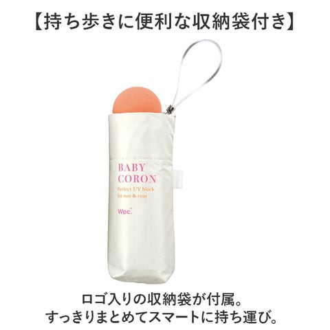 | 商品説明 | 【暑い季節に!遮熱・遮光パラソル】おしゃれに持ち歩けて、ストレスなくお出かけ!「Wpc. 遮光ベビーコロンmini」。【気分も上がるポップなデザイン☆】ころんと可愛らしいフォルムに温かみのあるカラーリング。持っているだけでテンションアップ!【遮光&UVカットで紫外線から守る】遮光率、UVカット率100%、UPF50+!光を通しにくく紫外線やブルーライトをカット。【暑さを凌いで、クールに快適】裏面にPUコーティングを。光を反射させて温度の上昇を防ぐ遮熱効果で、照り返しもガード。【雨でも使えて、お天気の急変に対応】防水効果もあり、突然の雨からもガード。いざという時も役立つ晴雨兼用タイプ。(※)UVカット・遮光・遮熱効果を主な目的とした日傘です。はっ水度は5級ですが、完全防水ではありません。【セーフカバー付きの手開きタイプ】傘骨をポキポキ折らず、スムーズに開閉。手指を挟みにくいよう配慮された安心設計。【サクッと留められるボタン式バンド】傘生地を留めるバンドは、バチンっと留めやすいスナップボタン式。【持ち歩きに便利な収納袋付き】ロゴ入りの収納袋が付属。すっきりまとめてスマートに持ち運び。【小さくても頼れる味方!】軽くてコンパクトなのに、UV機能などが充実◎カバンに忍ばせておけば、いつでも安心。【選ぶのも楽しいバリエーション】集めたくなるようなカラーをラインナップ。本体と持ち手のバイカラー配色がアクセント♪ |