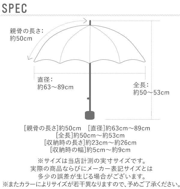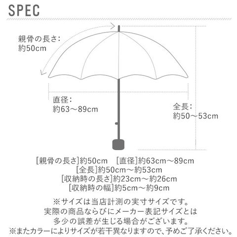 | サイズ | 傘の全長:50cm 傘の直径:89cm 親骨の長さ:50cm 収納時:長さ25cm 幅9cm ※サイズは当店平置き実寸サイズです。実際のサイズと多少の誤差が生じる場合がございます。ご了承ください。 |