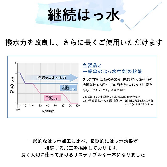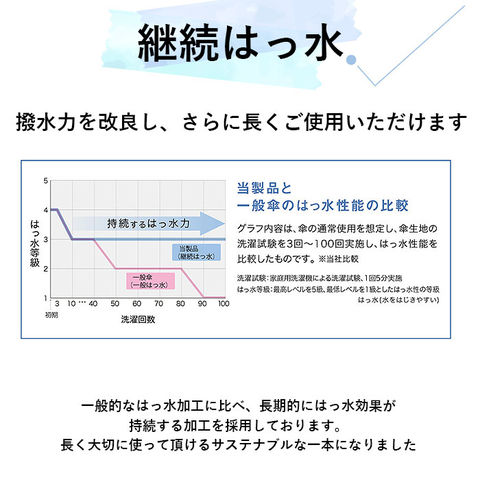 | 注意点 | 傘生地は濃色のプリント色が淡色部分に色移りする移行昇華という現象が現れる事がございます。現在の染色技術では完全に防ぐ事はできませんのでご了承ください。ハンドクリームや日焼け止めクリーム等が、生地・手元の色落ちの原因になる場合があります。ご使用後は陰干しして十分に乾燥させてから次回ご使用ください。ご使用後濡れたまま放置すると防水はっ水力の低下や骨の劣化につながります。ご使用後は、直射日光や高温多湿の場所を避けて保管してください。傘生地には防水はっ水加工を施し、縫製にははっ水糸を使用していますが、激しい雨や長時間のご使用では雨が染み込むことがございます。また、飾り加工部分(刺繍、ステッチ、バイピング等)は、デザインの特性上完全な防水はっ水加工が難しい場合があり雨が染みやすいのでご注意ください。降水量が20mm以上の場合、ある程度使用されますと漏水の恐れがありますのでご注意ください。傘生地の防水はっ水力は、ご使用頻度に比例して低下してくることは避けられません。長くご使用いただくには、市販の防水スプレー等でケアして頂くことをお勧めします。お子様には保護者の方からご注意ください。この製品は雨傘としてお使い頂くことを主としていますが、紫外線防止効果があります。但し、色の濃淡によって紫外線遮へい率が異なります。次の数値を目安としてご参照下さい。[淡色:約80% 濃色:約90%][グラスファイバー骨の取り扱いについて]グラスファイバー部分には、素手でさわらないでください。キズついたり、ささくれたグラスファイバーに触れると手や指にガラス繊維のトゲがささることがあり危険です。カメラやモニターの性質により、画像と実物の色の違いがある場合がございますのでご理解願います。 |