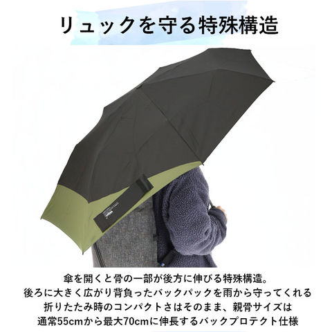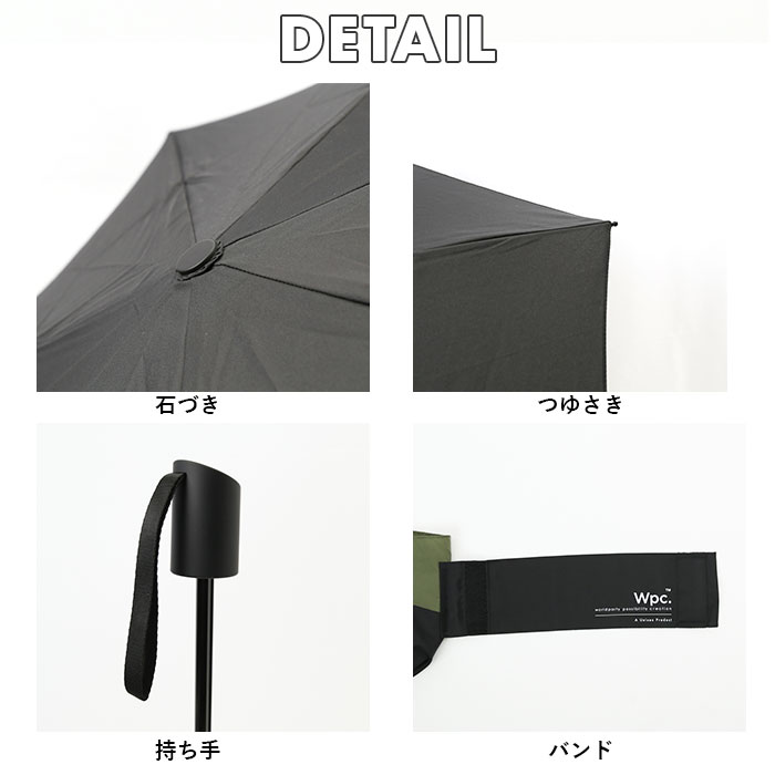 | 商品説明 | 雨の日もお洒落でいたい女性に人気!レイングッズブランド「Wpc.」から「BACK PROTECT・フォールディングアンブレラ」が新登場。傘を開くと、傘骨の一部が後方に大きく広がるユニークな構造で、大切なバックパックもコートの裾も、雨粒からしっかりカバー。折りたたみ時のコンパクトさはそのまま、親骨サイズは通常55cmから最大70cmに伸長するバックプロテクト仕様。傘生地には一般の傘と比べ、はっ水効果が長期間持続する「継続はっ水」加工済み。使用後はサッとひと振りで驚異の水切れ。紫外線遮蔽率80%以上の紫外線防止効果があり、日射しの強い季節でも活躍する晴雨兼用タイプ。(※紫外線遮蔽率は生地色の濃淡により異なります。淡色:80%、濃色90%)サイドファスナーが付いた収納袋で、取り出しも、傘をたたんだ後の収納もスムーズに。傘をさしている時には、収納袋を傘内側のポケットに収納することができるので、紛失防止にも!「Wpc.」のロゴがプリントされた、幅広タイプの面ファスナーベルトが印象的なワンポイント。単色カラーとバイカラー、2タイプのスタイリッシュなラインナップで、男女問わずにスタイリング自在なユニセックスデザイン。 |