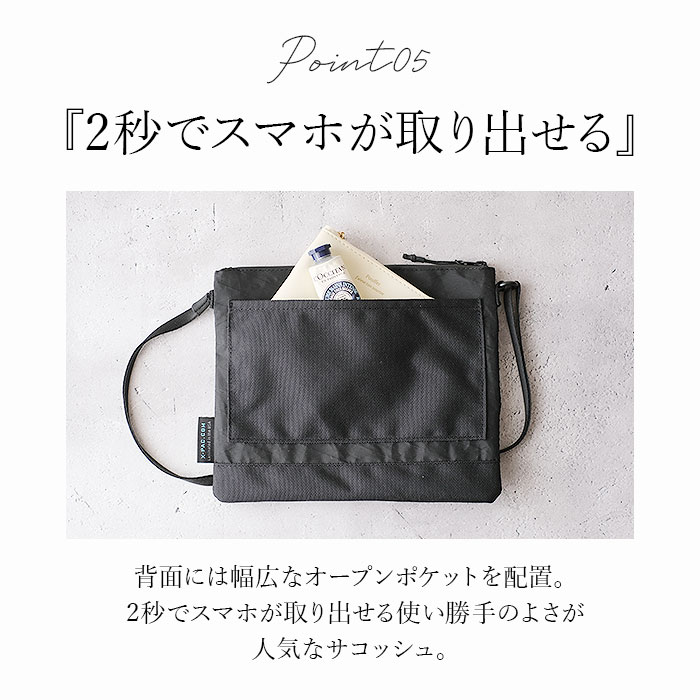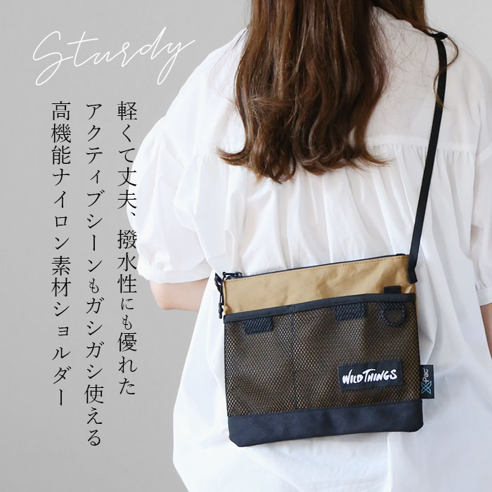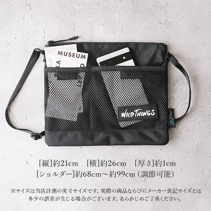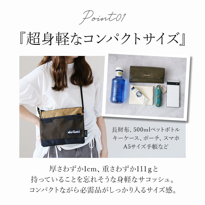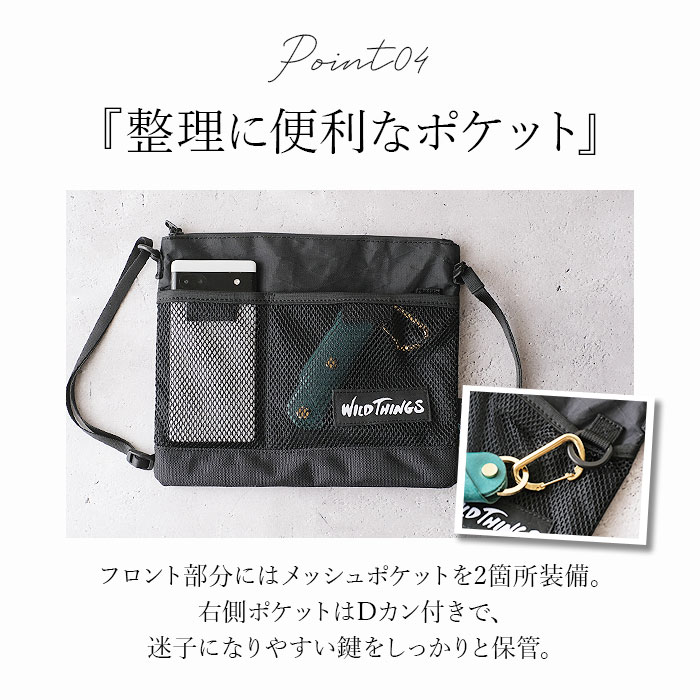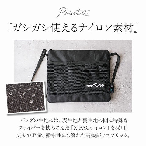 | 商品説明 | 肩にサッと掛けて、手ぶらでお出掛け!タフ&ワイルドなアイテムが魅力の「WILD THINGS -ワイルドシングス-」から、シンプルなサコッシュバッグが新登場。【必須アイテムをひとまとめ】マチの薄いスリムなボディに、長財布や500mlペットボトルなど、お出掛け用のマストアイテムがミニマルに収納できるサイズ感。【高機能なX-PACナイロン素材】バッグの生地には、表生地と裏生地の間に特殊なファイバーを挟みこんだ「X-PACナイロン」を採用。丈夫で軽量、はっ水性にも優れており、アウトドアに最適な高機能ファブリック。【安心の止水ファスナー仕様】メインルーム開口部は、小物がこぼれ落ちる心配のない天ファスナータイプ。水が染みこみにくい止水ファスナーを使用しているので、突然の雨でも大丈夫!【クールなメッシュポケット】フロントには、中の小物がひと目でわかる仕切りメッシュポケットを配置。内側のDカンにリール付きパスケースやキーケースを繋いで使うと便利。【幅広め背面ポケット】身体に当たる背面側にもバッグの幅いっぱいのオープンポケットがあり、大切なスマホやコインコインケースの収納にオススメ。【両手が空いて、アクティブに】細めにデザインされた華奢なショルダーベルトで、肩掛けor斜め掛けもスタイリング自在。両手がフリーになって、いつでもアクティブでいたい人に最適。【ユニセックスデザイン】お気に入りの小物を入れて、カフェやショッピングなどちょっとしたお出掛けに最適。休日のパパや彼にはもちろん、マニッシュにキメたい女子にもオススメなユニセックス仕様!【ポケット仕様】[バッグ前面]面ファスナー式メッシュポケット×2[バッグ背面]オープンポケット×1 |