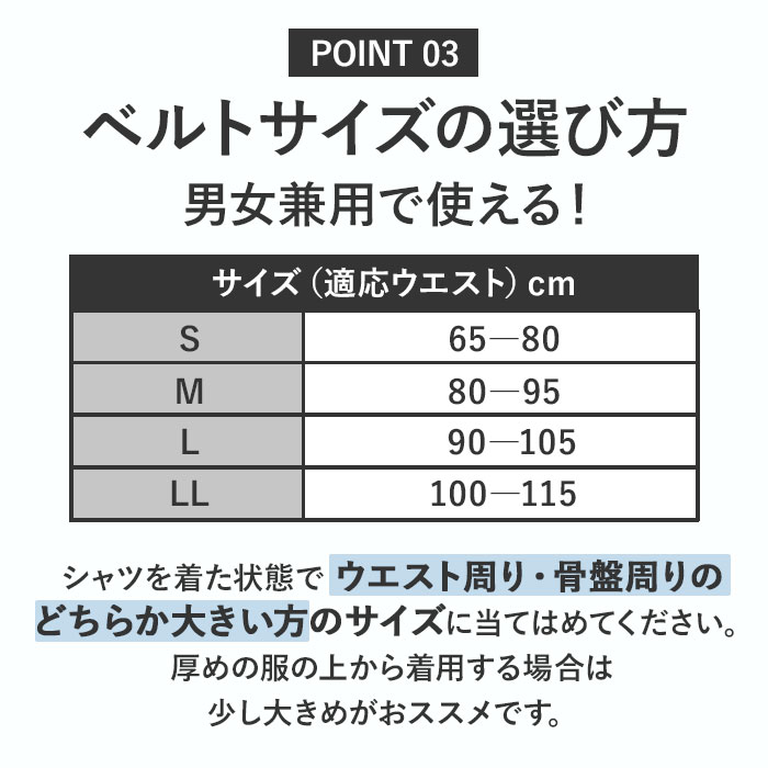 | サイズ | [ユニセックス] ・Sサイズ(適応ウエスト65-80cm) ・Mサイズ(適応ウエスト80-95cm) ・Lサイズ(適応ウエスト90-105cm) ・LLサイズ(適応ウエスト100-115cm) ※サイズはメーカー公表サイズです。実際の商品とは多少の誤差が生じる場合がございます。あらかじめご了承ください。 |