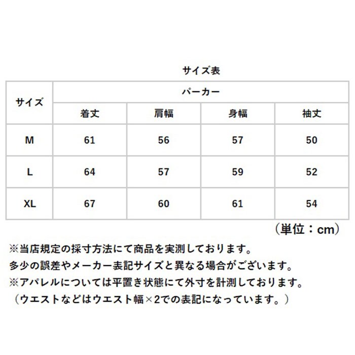 | サイズ | [レディース] ・Mサイズ ・Lサイズ ・XLサイズ ※サイズについて詳細は、商品画像の中にあるサイズ表をご覧くださいませ。 |