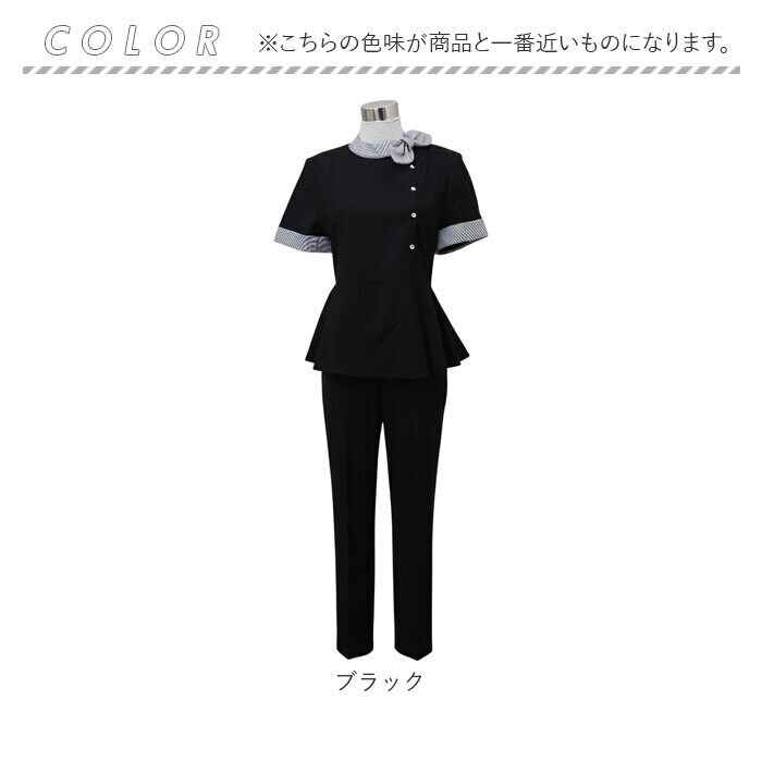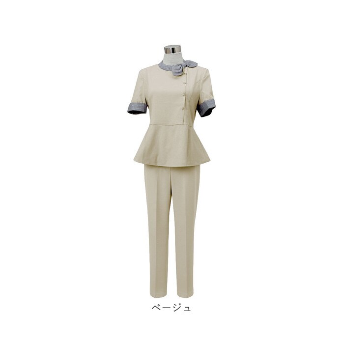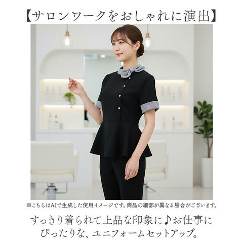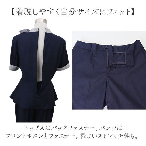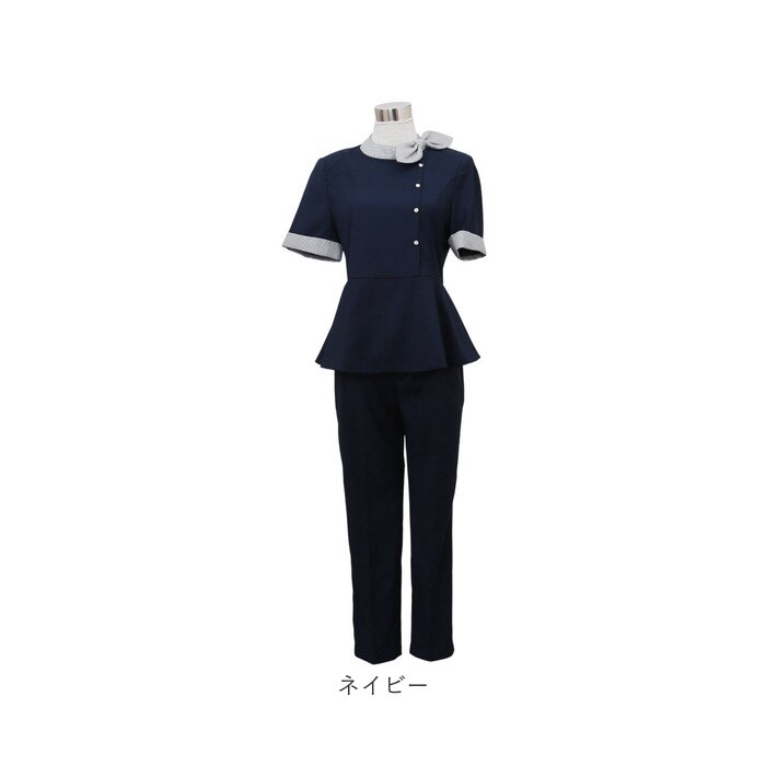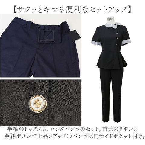 | 商品説明 | 【サロンワークをおしゃれに演出】すっきり着られて上品な印象に♪お仕事にぴったりな、ユニフォームセットアップ。【お仕事中もテンションアップ】美容系サロンやクリニックなど、接客のお仕事に。大人な着こなしを楽しめるのが嬉しい◎【サクッとキマる便利なセットアップ】半袖のトップスと、ロングパンツのセット。首元のリボンと金縁ボタンで上品さアップ〇パンツは両サイドポケット付き。【着脱しやすく自分サイズにフィット】トップスはバックファスナー、パンツはフロントボタンとファスナー。程よいストレッチ性も。 |