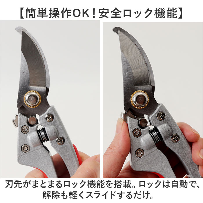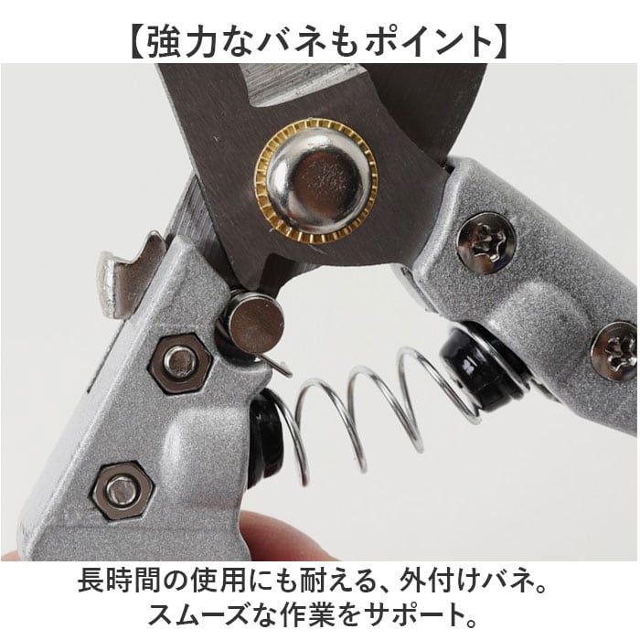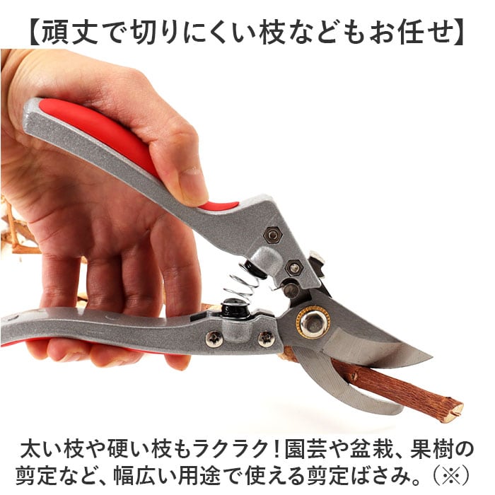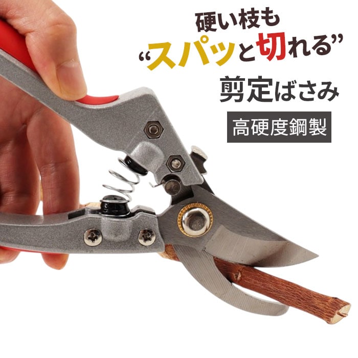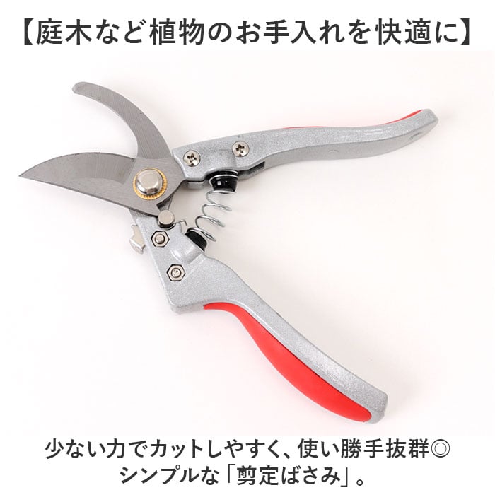 | 商品説明 | 【庭木など植物のお手入れを快適に】少ない力でカットしやすく、使い勝手抜群◎シンプルな「剪定ばさみ」。【頑丈で切りにくい枝などもお任せ】太い枝や硬い枝もラクラク!園芸や盆栽、果樹の剪定など、幅広い用途で使える剪定ばさみ。(※)耐久性に優れた高炭素鋼製です。収納ケースなどは付属しておりませんので、持ち運びや保管の際には刃先にご注意ください。【簡単操作OK!安全ロック機能】刃先がまとまるロック機能を搭載。ロックは自動で、解除も軽くスライドするだけ。【握りやすさを考えたハンドル形状】効率的に力を伝えやすいフォルム&滑り止め付き。握力があまりない女性にもおすすめ。【強力なバネもポイント】長時間の使用にも耐える、外付けバネ。スムーズな作業をサポート。 |
