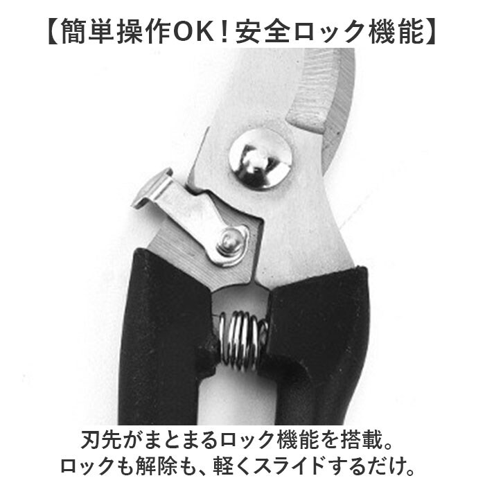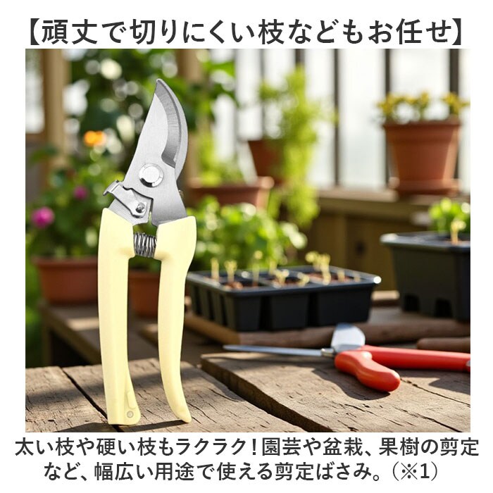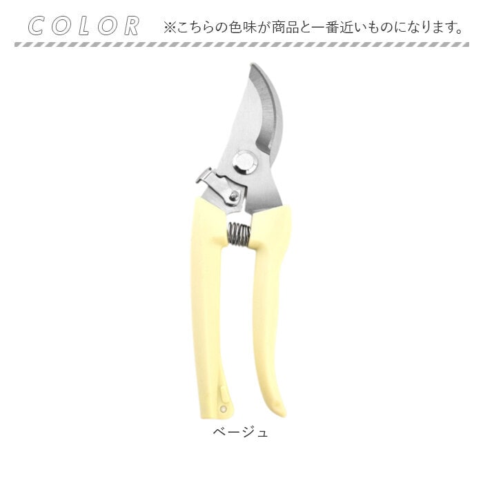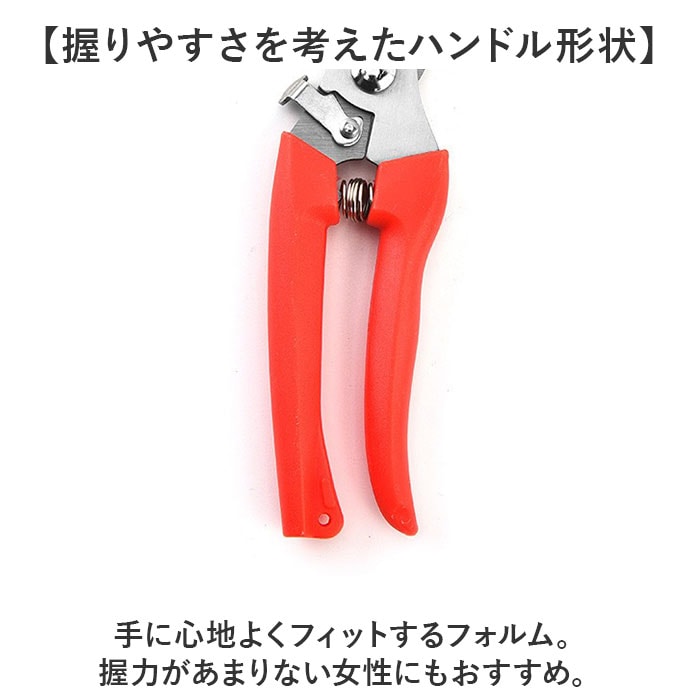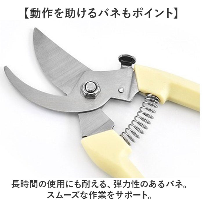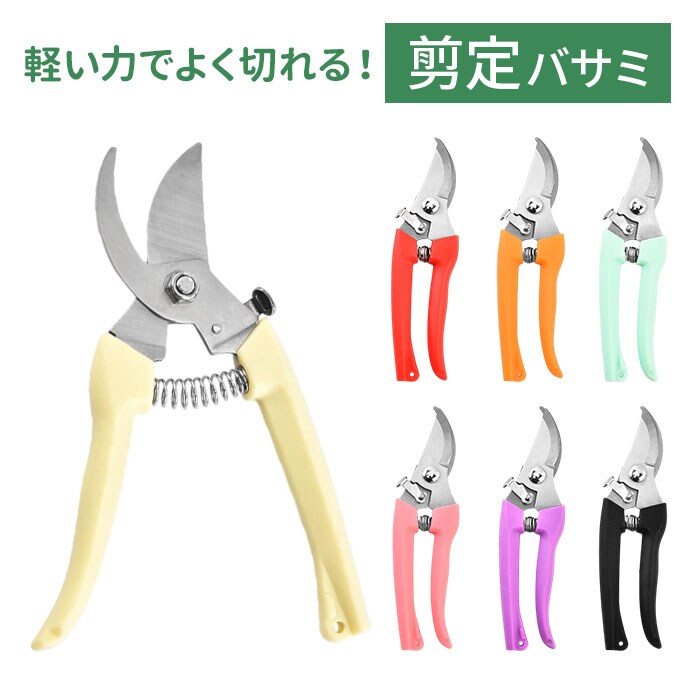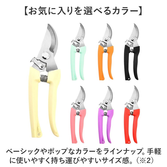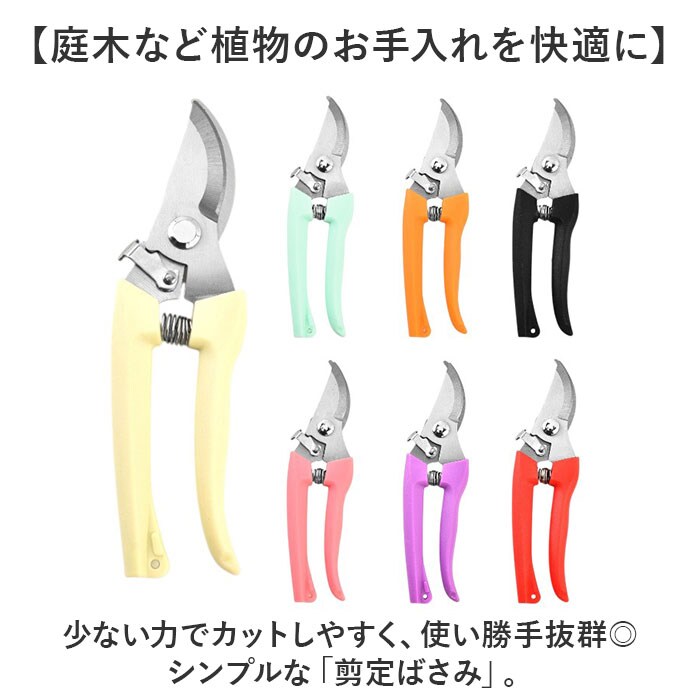 | 商品説明 | 【庭木など植物のお手入れを快適に】少ない力でカットしやすく、使い勝手抜群◎シンプルな「剪定ばさみ」。【頑丈で切りにくい枝などもお任せ】太い枝や硬い枝もラクラク!園芸や盆栽、果樹の剪定など、幅広い用途で使える剪定ばさみ。(※1)刃先はサビにも強いステンレス製です。【簡単操作OK!安全ロック機能】刃先がまとまるロック機能を搭載。ロックも解除も、軽くスライドするだけ。【握りやすさを考えたハンドル形状】手に心地よくフィットするフォルム。握力があまりない女性にもおすすめ。【動作を助けるバネもポイント】長時間の使用にも耐える、弾力性のあるバネ。スムーズな作業をサポート。【ストレスなく使える軽やかさ】片手で持ちやすい軽量設計。長時間の作業でも疲れにくいのが嬉しい◎【お気に入りを選べるカラー】ベーシックやポップなカラーをラインナップ。手軽に使いやすく持ち運びやすいサイズ感。(※2)収納ケースなどは付属しておりませんので、持ち運びや保管の際には刃先にご注意ください。 |