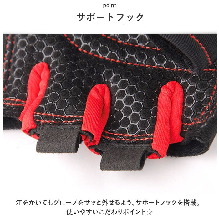 | 商品説明 | トレーニングのパフォーマンスをUP!ジムや自宅での筋トレに「トレーニンググローブ」が登場。【フィット感】バツグンのフィット感で、物を握りやすく、動きやすくしてくれるアイテム。手の湾曲に合わせた設計で効率UP!【クッション性】手のひらの負担軽減のため、クッション機能を採用。ハニカム構造の滑り止め付きで手のひらを楽にしてくれる。【手首の保護】手首のバンドはしっかり巻ける長めの設計。手首を固めて保護できるのでケガの防止効果も◎安全性UP。【軽量】重さが気にならないよう、軽量設計に。トレーニング中の集中力を邪魔しない。【サポートフック】汗をかいてもグローブをサッと外せるよう、サポートフックを搭載。使いやすいこだわりポイント☆【通気性◎】長時間のトレーニングでも快適に過ごせるよう、通気性バツグンの作りに。ムレを軽減。 |