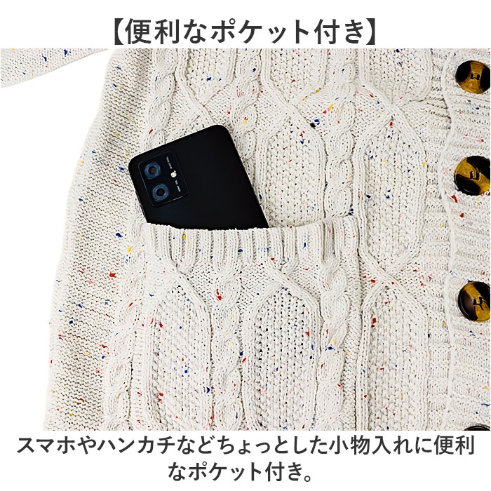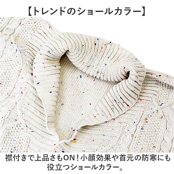 | 商品説明 | 【シンプルで高見え◎】程よい厚みと凹凸のあるケーブルで編みで、シンプルながらも高見え効果もあるカーディガン♪【立体的なケーブル編み】前面にクラシカルで温かみを感じるケーブル編みデザインを採用。【羽織るだけで様になる】ベーシックな色展開なので、どんな服にも合わせやすく着回し力バツグン。【トレンドのショールカラー】襟付きで上品さもON!小顔効果や首元の防寒にも役立つショールカラー。【ナチュラルに仕上がるボタン】木目調のボタンを使用し、ナチュラルさもプラス。大人カジュアルに着こなせる◎【ちょっとした遊び心も】生地の中にカラフルな糸を織り込み、ワンカラーに遊び心を取り込んだ仕上がり。【便利なポケット付き】スマホやハンカチなどちょっとした小物入れに便利なポケット付き。【エイジレスで使える】シンプルなデザインなので年代問わず使えるのも嬉しいポイント。 |
