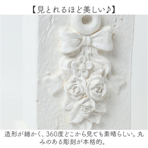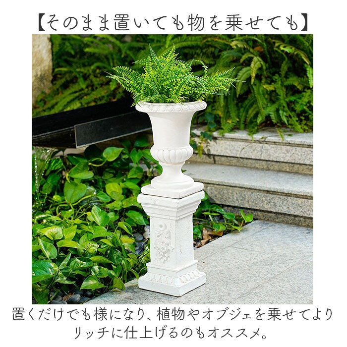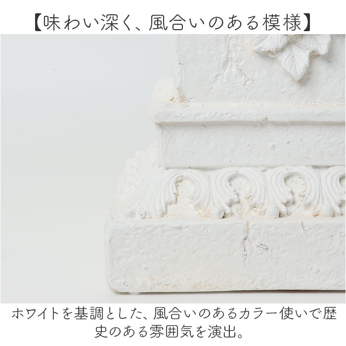 商品説明【置くだけでリッチな空間に♪】重厚感のある作りで、しっかり高見え「ガーデンオブジェ ローマスタンド」が登場。【玄関やガーデニング空間を彩る】高級感のあるアンティーク調のオブジェ。室内、屋外どちらにも置ける、安定したデザイン。【見とれるほど美しい♪】造形が細かく、360度どこから見ても素晴らしい。丸みのある彫刻が本格的。【味わい深く、風合いのある模様】ホワイトを基調とした、風合いのあるカラー使いで歴史のある雰囲気を演出。【そのまま置いても物を乗せても】置くだけでも様になり、植物やオブジェを乗せてよりリッチに仕上げるのもオススメ。【角のない安全設計】角に丸みをつけ、安全性にも配慮。ペットやお子様のいるお家でも安心して使用できる。