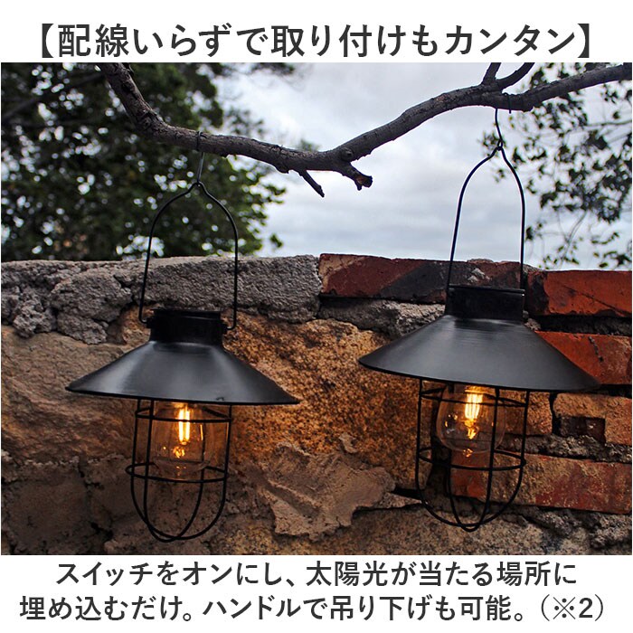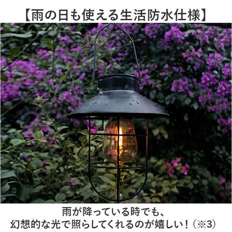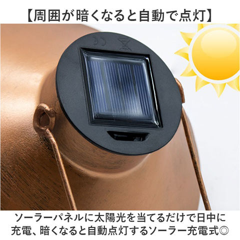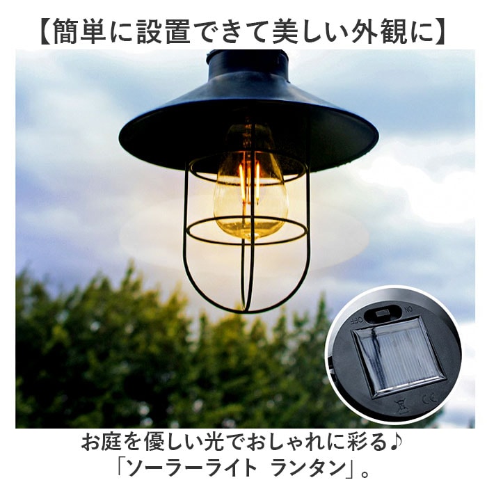 | 商品説明 | 【簡単に設置できて美しい外観に】お庭を優しい光でおしゃれに彩る♪「ソーラーライト ランタン」。【周囲が暗くなると自動で点灯】ソーラーパネルに太陽光を当てるだけで日中に充電、暗くなると自動点灯するソーラー充電式◎【電気代0円!繰り返し使えてエコ】電池交換の手間を省け、お財布に優しいライト。電源不要で場所を選ばない◎(※1)連続点灯時間の目安は約6~12時間。環境や充電時間などにより異なります。【配線いらずで取り付けもカンタン】スイッチをオンにし、太陽光が当たる場所に埋め込むだけ。ハンドルで吊り下げも可能。(※2)埋め込みの場合、高さ調節が可能です。【雨の日も使える生活防水仕様】雨が降っている時でも、幻想的な光で照らしてくれるのが嬉しい!(※3)完全防水ではないため、豪雨や台風の日には使用しないでください。【レトロな雰囲気を演出】シンプルでレトロ感のあるデザイン。お気に入りを選べる2カラー。 |