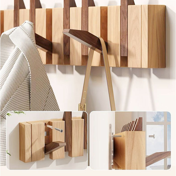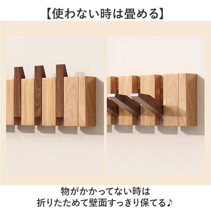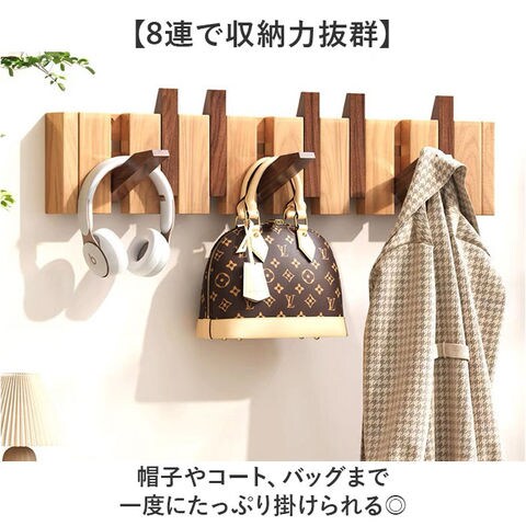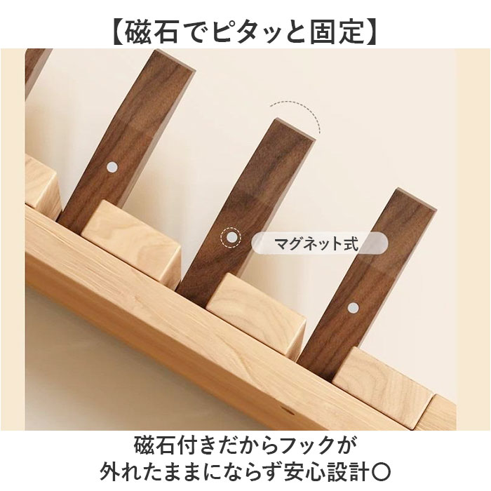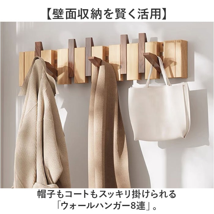| 商品説明 | 【壁面収納を賢く活用】帽子もコートもスッキリ掛けられる「ウォールハンガー8連」。【8連で収納力抜群】帽子やコート、バッグまで一度にたっぷり掛けられる◎【使わない時は畳める】物がかかってない時は折りたためて壁面すっきり保てる♪【磁石でピタッと固定】磁石付きだからフックが外れたままにならず安心設計〇【壁に合わせて取り付け】ピンとネジどちらも付属で壁の種類を選ばず設置可能!【天然木の温もり】ナチュラルな木製素材で壁面をおしゃれに演出できる。 |