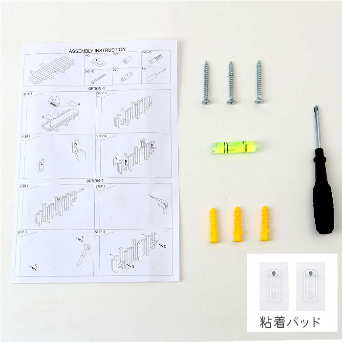 | 注意点 | [付属品]粘着シール x 2個、プラスドライバー x 1本、ネジ x 3本※拡張プラグ x 3本、水平器 x 1個海外輸入品のため、商品によってはパッケージや説明書が、英語や中国語表記となっている場合があります。商品を安価でご提供させていただくため、輸入時のパッケージのままでのお届けとなります。予めご了承くださいませ。海外輸入品のため、パッケージに破れ、傷やへこみがある場合がございます。本体には問題ございませんので、予めご了承くださいませ。商品の写真はできる限り実物のお色に近づけるように加工しておりますが、お使いのモニター設定、お部屋の照明などにより、実際の商品と異なる場合がございます。商品や個体差などにより、表記と若干異なる場合がございますが、予めご了承くださいませ。採寸方法の違いにより、多少の誤差がある場合がございます。こちらの商品本体、及び商品についている印字やタグに関しては、海外メーカー独自のサイズ情報や表記になります。実際には、当社にて日本向けに正しい情報をページに掲載させて頂いております。 |