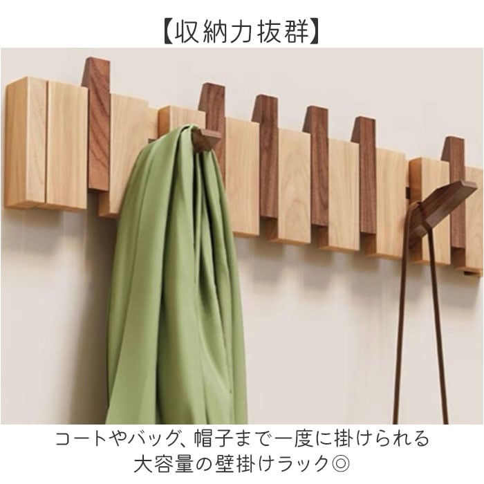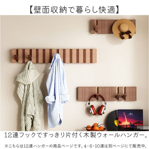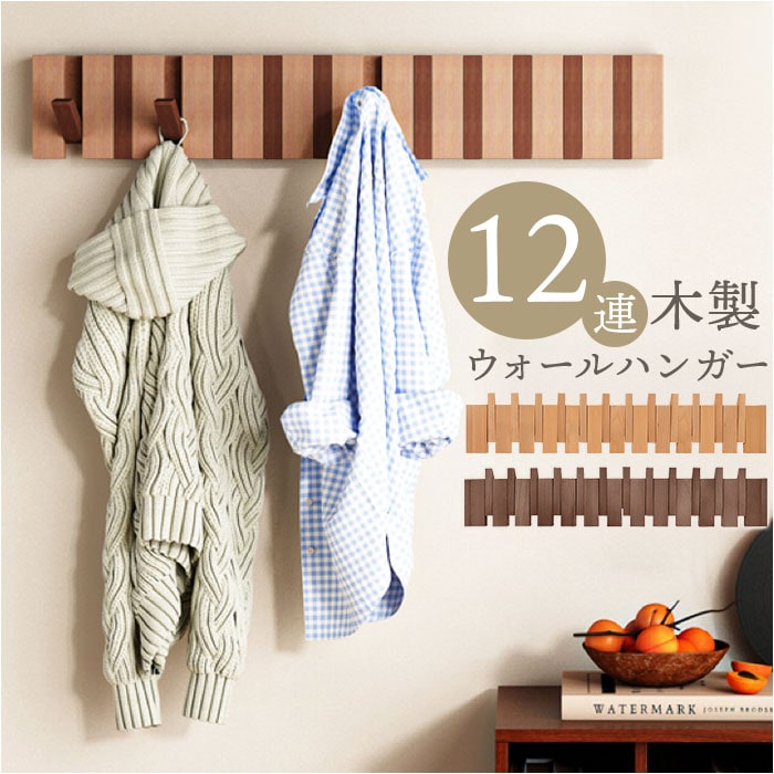 | 商品説明 | 【壁面収納で暮らし快適】12連フックですっきり片付く木製ウォールハンガー。【収納力抜群】コートやバッグ、帽子まで一度に掛けられる大容量の壁掛けラック◎【省スペース設計が魅力】玄関や廊下のわずかな壁面を活用して収納スペースを確保できる♪【見せる収納でおしゃれ空間】木目調の上品なデザインが備え付け家具のようなインテリア性を演出〇【選べる2WAY取付方法】ピンなら壁に傷をつけず、ネジなら粗い壁面にもしっかり固定できる!(※ピンの貼り付け対応可能は滑らかな壁面で壁紙には使用できません。負担重量5kg、ネジの設置負担重量30kg)【忘れ物防止にも役立つ】よく使うアイテムを目に見える場所に掛けてお出掛け前の確認もスムーズ。 |