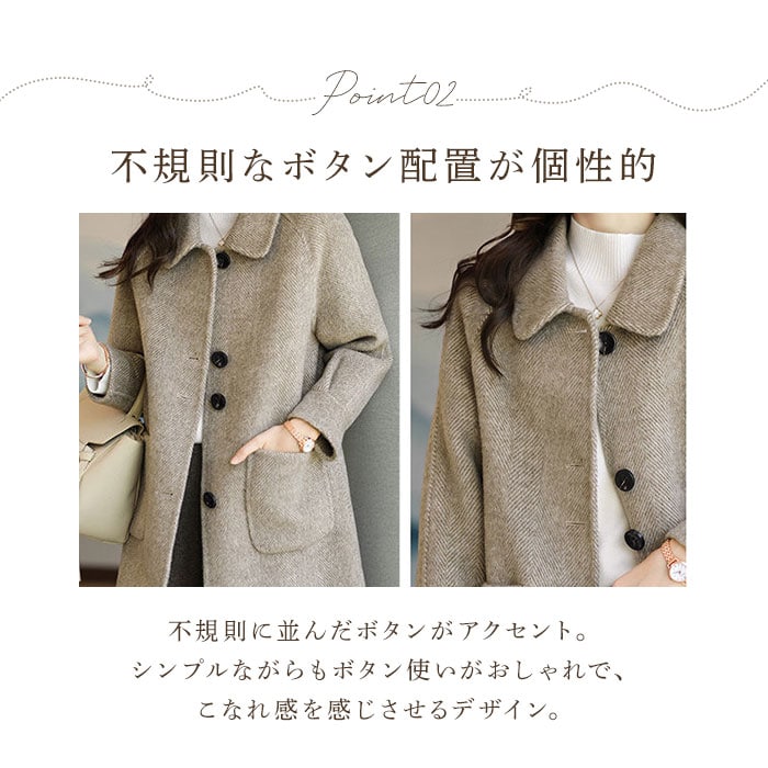 | 商品説明 | シンプルデザインで、ONもOFFもオトナおしゃれにキマる♪「チェスターコート」が登場。【いろんなシーンで】・ONとOFF、どちらでも使える◎襟付きなので、カジュアルな普段着も大人っぽく仕上げてくれる万能アイテム。【おしゃれなボタン使い】不規則に並んだボタンがアクセント。シンプルながらもボタン使いがおしゃれで、こなれ感を感じさせるデザイン。【便利なポケット付き】両サイドのポケットはミニ財布やスマホが入るサイズ感。【選べる2タイプ】裏地はノーマルタイプとキルティングタイプの2種類。お好みに合わせてチョイスして!【シンプルデザイン】ベーシックでシンプルなデザイン。お洋服に合わせやすく、どんなスタイルにも幅広くマッチ。流行り廃りのないデザインなので長く愛用できる。 |