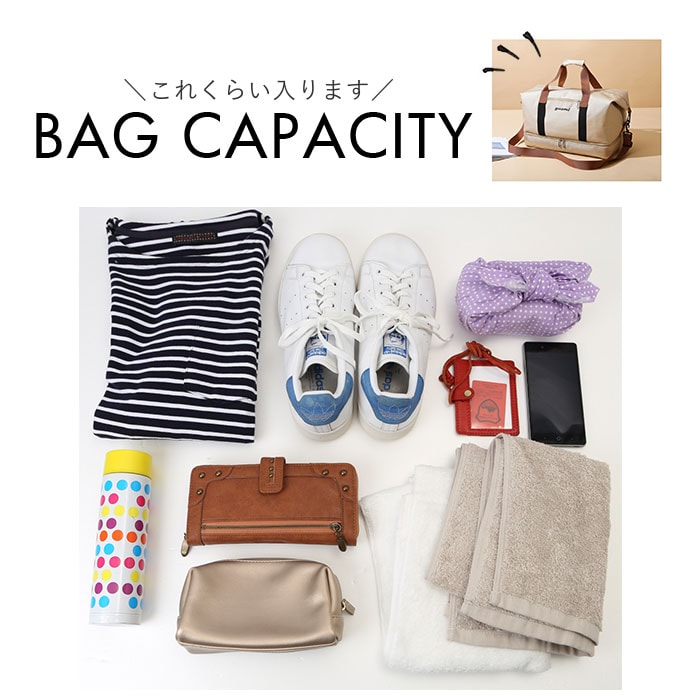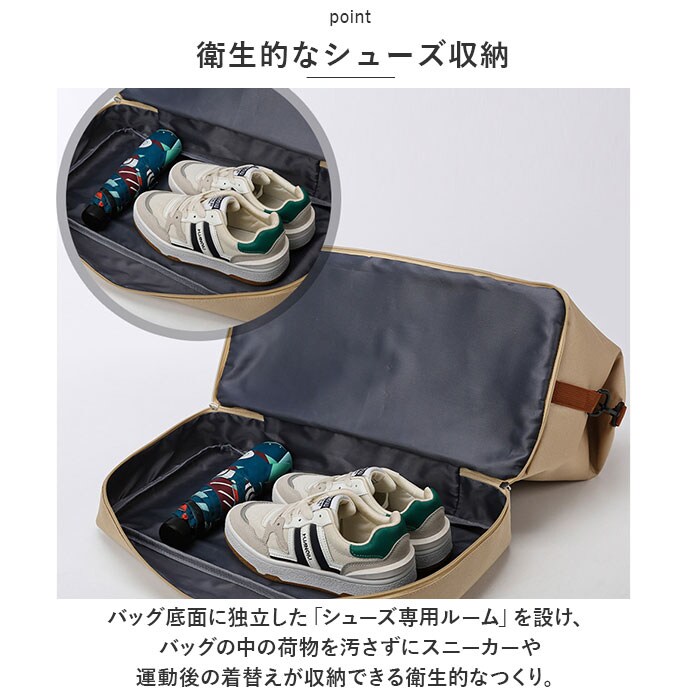 | 商品説明 | 旅行用だけなんてもったいない♪フィットネスジムや、学生さんの部活用にもお洒落に使える「2WAYボストンバッグ」が新登場。【旅行時のマニッシュコーデに】お出掛けファッションにすんなりと馴染む、落ち着きを感じさせるアースカラーに、2色に貼り分けたハンドルがパッと目を惹く、メンズライクなコーデを叶えるユニセックスデザイン。【大容量でもスタイリッシュ】メインルームはB4サイズに対応した約36リットルの大容量設計。2泊3日程度の衣類や化粧ポーチなどのアイテムもすっぽりと収納できるサイズ感。【パッキング作業がスムーズ】開口部は左右に大きく開くダブルファスナーを採用。バッグの中がひと目で見渡せて、旅行前のトラベルグッズのパッキングがスムーズ。【マストアイテムを定位置に】メインルーム内側には、お財布やメガネケースなどの小物やトラベルグッズの整理に役立つオープンポケット×3つに、長財布もすっぽり収まる大きめサイズのファスナーポケット×1を配置し、カバンの中で迷子になりがちな小物をピタッと定位置に収納!【ジムに最適・はっ水ポケット】長財布サイズの大きめポケットは、運動後のスポーツウェアやタオル、濡れた水着などを分けて持ち帰ることのできるはっ水機能付き。(※完全防水仕様ではありません。水分を多く含んだ物を収納すると、ファスナー開口部から水が染みだすことがあります。)【衛生的なシューズ収納】バッグ底面に独立した「シューズ専用ルーム」を設け、バッグの中の荷物を汚さずにスニーカーや運動後の着替えが収納できる衛生的なつくり。【小物にクイックアクセス】バッグ正面のミニファスナーポケットからは、スマホやパスケースなど出番の多い小物がスグに取り出せて便利!(※スマートフォンのサイズによっては収納できない場合がございます。)【スタイリング自在の2WAY仕様】ハンドルカバー付きのハンドルをサッと握れば手提げスタイルに。荷物が多くなった時には、カバンを肩に掛けて颯爽と歩けるショルダーベルトが付属。 |