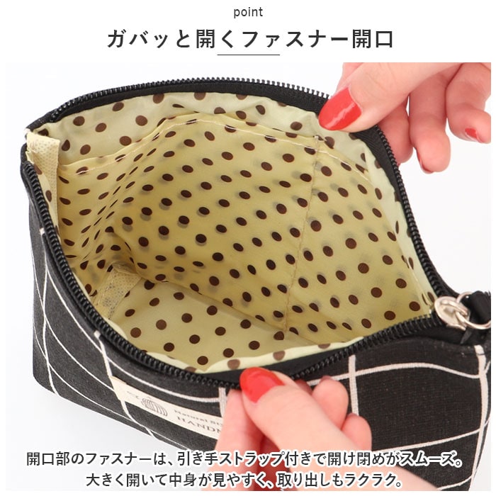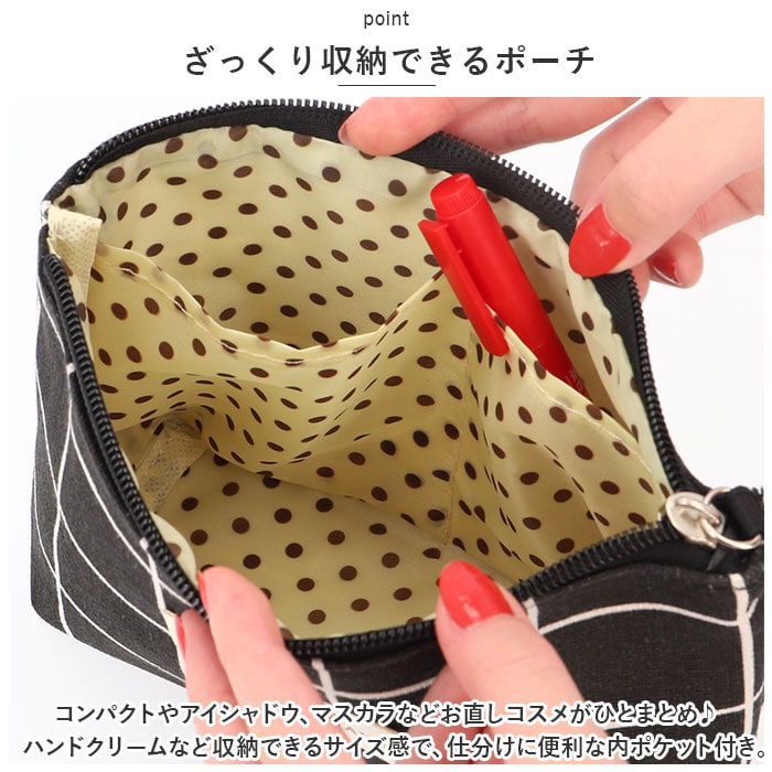 | 商品説明 | 小物を整理整頓できる!ナチュラル可愛いポーチが新登場。【すっきりとしたフォルム】程よいマチを設けたスリムな台形デザイン。バッグの中でかさばりにくく、持ち運びに便利。【ガバッと開くファスナー開口】開口部のファスナーは、引き手ストラップ付きで開け閉めがスムーズ。大きく開いて中身が見やすく、取り出しもラクラク。【ざっくり収納できるポーチ】コンパクトやアイシャドウ、マスカラなどお直しコスメがひとまとめ♪ハンドクリームなども収納できるサイズ感で、仕分けに便利な内ポケット付き。【マルチに活躍】サニタリーグッズやお菓子などを入れてもOK。荷物が増えがちな旅行などでも重宝◎サラッとした質感の裏地付き。【お気に入りをチョイス】年代問わず持ちやすいデザインをラインナップ。フロントのロゴタグもアクセントに。【ポケット仕様】内側:オープンポケット×2 |