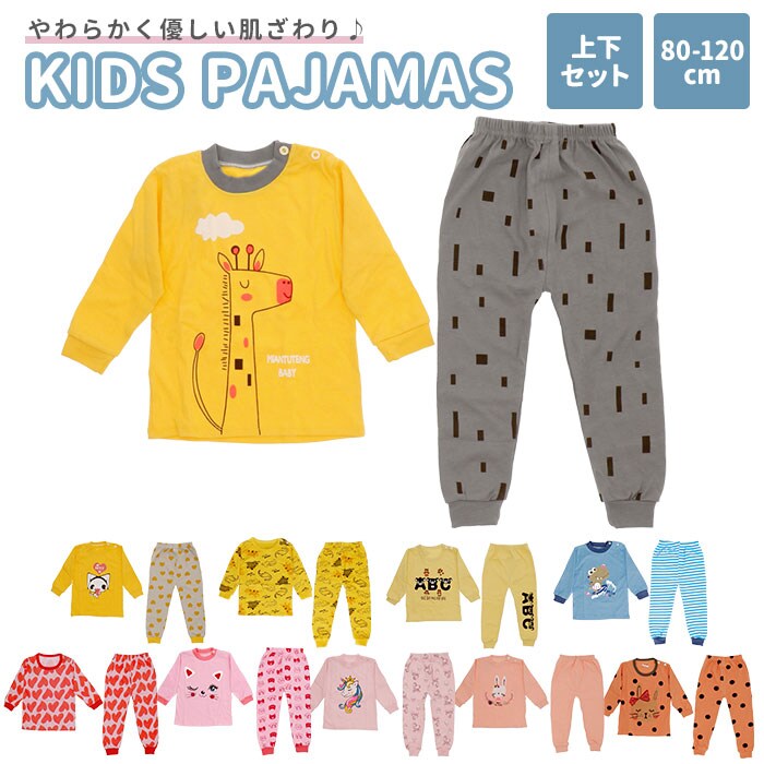 | 商品説明 | 柔らかく優しい肌触り♪キッズ用パジャマ(上下セット)が発売。程よい厚みの生地感で春秋はもちろん、夏は冷房対策に、冬はインナーとして、オールシーズン使える◎80サイズ~100サイズのトップスは襟元にボタンが付いており、着脱が楽ちん。(※110サイズ、120サイズにはボタンが付いておりません。)ズボンはお腹を締め付けないウエストゴム仕様。ポップで可愛いイラストデザイン♪80サイズ~120サイズまでの5サイズ展開だから、兄弟・姉妹お揃いで着れちゃう♪ |