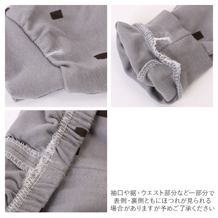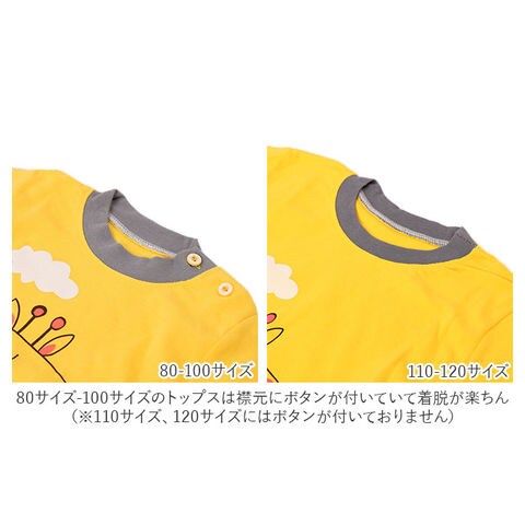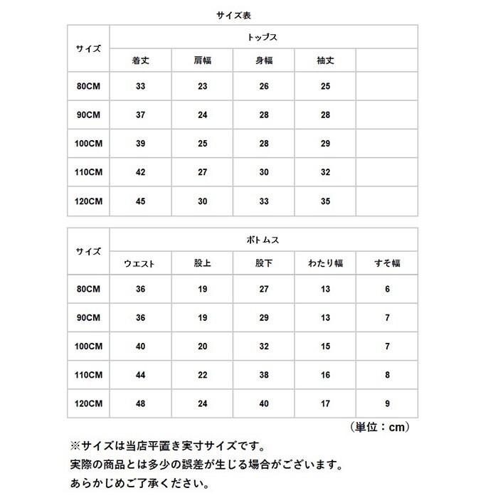 | 注意点 | 110cmサイズ、120cmサイズは襟元横のボタンは無いデザイン、その他のサイズは襟元横のボタンがあるデザインとなっております。よくご確認の上、ご購入ください。商品の写真はできる限り実物のお色に近づけるように加工しておりますが、お使いのモニター設定、お部屋の照明などにより、実際の商品と異なる場合がございます。商品や個体差などにより、表記と若干異なる場合がございますが、予めご了承くださいませ。輸入品のため、特にトップス裾や袖・ズボンウエスト等の糸の継ぎ目や縫製等が甘い部分、糊跡等が生じる場合がございますが、予めご了承くださいませ。生地の特性上、やや匂いが強く感じられるものもございます。数日のご使用や陰干しなどで気になる匂いはほとんど感じられなくなります。配送の方法によっては、商品に多少のシワ等ができる場合がございますが、出来る限りお客様にリーズナブルな価格帯でご提供するためです。ご了承くださいませ。採寸方法の違いにより、多少の誤差がある場合がございます。 |