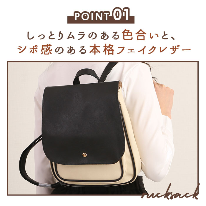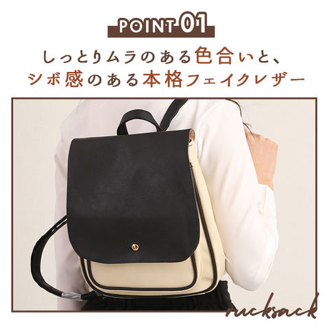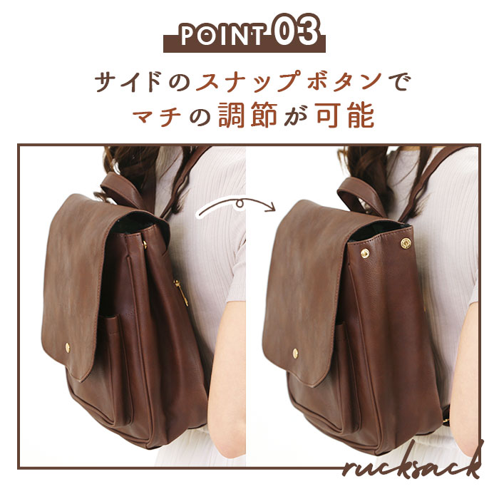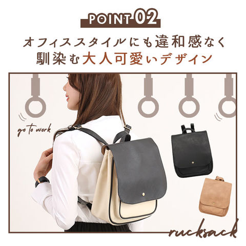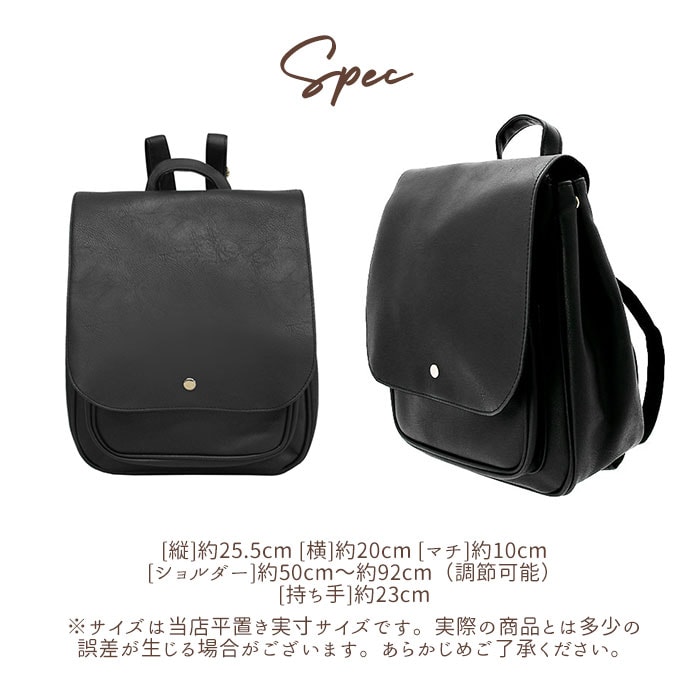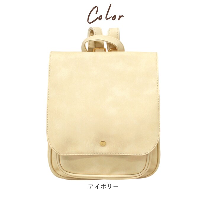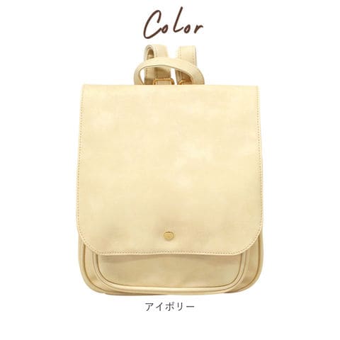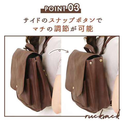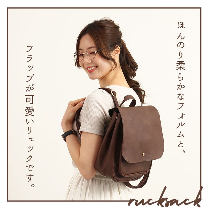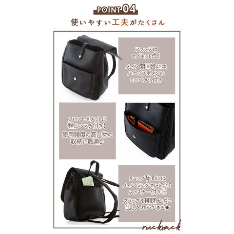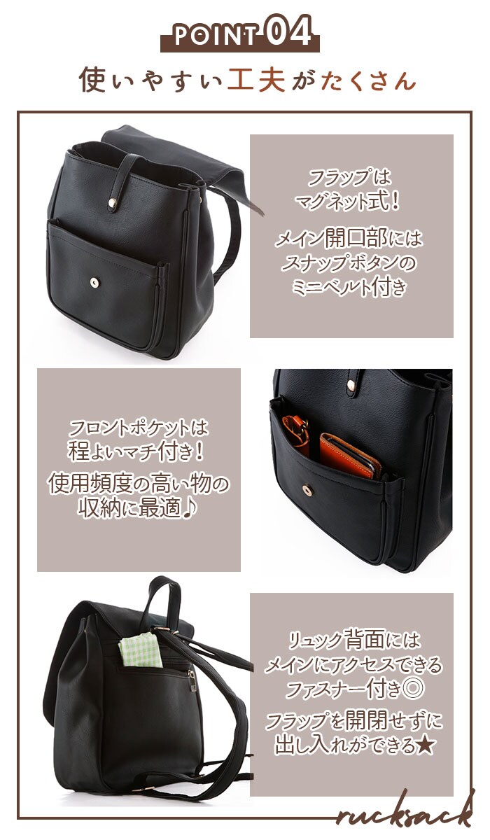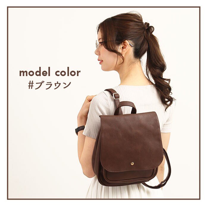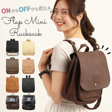 | 商品説明 | 角のとれたほんのり柔らかなフォルムと、大きめフラップが可愛い!ONでもOFFでも使えるフェイクレザーフラップミニリュック。しっとりムラのある色合いと、シボ感のある本格フェイクレザーを全面に使用して、レトロで大人可愛い雰囲気。キラリと光るゴールド色のカシメがワンポイント。フラップはマグネット式で簡単開閉!メイン収納開口部には、スナップボタン付きのミニベルトで、小物の飛び出しを防止!程よいマチのあるフロントポケットは、スマートフォンやキーケースなど使用頻度の高い小物がサッと取り出せて便利♪メイン収納スペースには、B5サイズのノートや長財布ペットボトルなど通勤通学に必要な小物がたっぷりと収納可能。マチはたっぷり約10cmで、コンパクトな見た目以上の収納力!マチはサイドのスナップボタンで調節可能。荷物が少ないときはボタンを閉じてスマートなフォルムで使用できるのが嬉しい☆リュック背面にはメイン収納に直接アクセスできるファスナー付き。フラップを開閉せずに出し入れができるので、小物が落下する心配が少なく、クイックアクセスできて便利!ベーシックな色使いでオフィススタイルにも違和感なく馴染む大人可愛いデザイン。カジュアルないつものスタイルに合わせてもOK! |