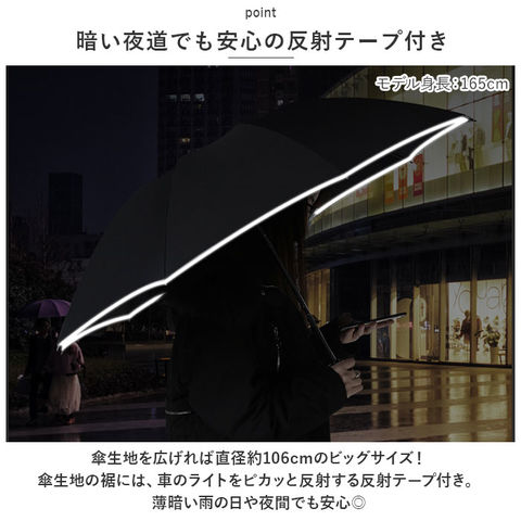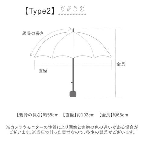 | サイズ | 【Type1】 [親骨の長さ]約55cm/[直径]約106cm/[全長]約65cm [収納時の長さ]約34cm [収納時の幅]約8cm 【Type2】 [親骨の長さ]約55cm/[直径]約102cm/[全長]約65cm [収納時の長さ]約33cm [収納時の幅]約8cm ※サイズは当店計測の実寸サイズです。実際の商品ならびにメーカー表記サイズとは多少の誤差が生じる場合がございます。あらかじめご了承ください。 |