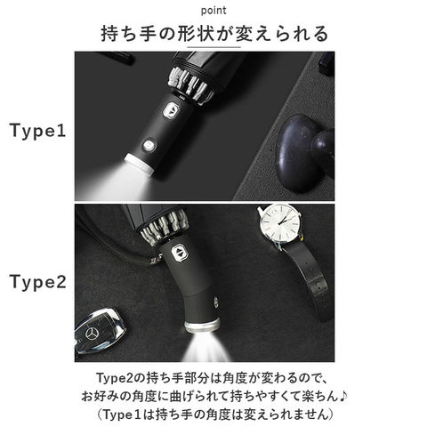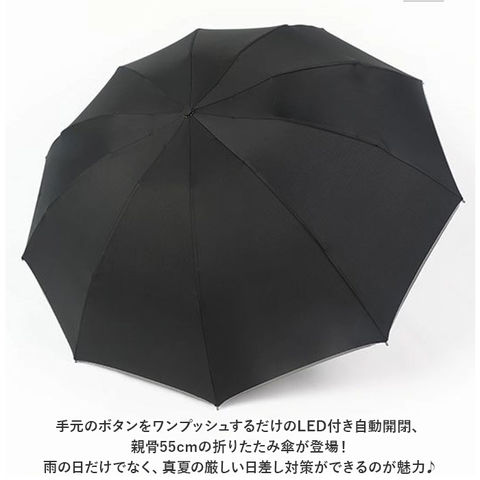 | 商品説明 | 手元のボタンをワンプッシュするだけのLED付き自動開閉、親骨55cmの折りたたみ傘が登場!【ワンタッチ自動開閉】ボタンを押すと自動で開閉できるので、荷物が多くても片手でサッと差すことができて便利♪【直径106cmのワイドサイズ】傘生地を広げれば直径約106cmのビッグサイズ!荷物や洋服の裾が濡れにくいのが嬉しい♪【逆さ折りで濡れにくい】傘を閉じる際、濡れた面が内側にくる逆さ折り構造を採用。傘を畳む時に手が濡れにくい設計で、ハンカチで手を拭く手間を軽減!【暗い夜道でも安心の反射テープ付き】傘生地の裾には、車のライトをピカッと反射する反射テープ付き。薄暗い雨の日や夜間でも安心◎【晴雨兼用】雨の日だけでなく、真夏の厳しい日差し対策ができるのが魅力♪【持ち手にLEDライト】持ち手についたLEDライトで足元の不安な雨の日や夜などに明るく照らしてくれる!【持ち手の形状が変えられる】Type2の持ち手部分は角度が変わるので、お好みの角度に曲げられて持ちやすくて楽ちん♪(Type1は持ち手の角度は変えられません)【ストラップ付き】持ち手にストラップがついているので、バッグなどにしまわずに手首に下げておけるので買い物時などに便利。【面ファスナー付きバンド】傘生地をまとめるバンドは面ファスナー式でサッと傘が広げやすく、生地をたたむ時にも手間取らない。【シンプルなデザイン】シンプルデザインとシックな色合いなので、年代性別問わず使え通勤・通学・お出かけ時に最適。 ※(布)タイプは通常の晴雨兼用です。()がないタイプは内側に黒いコーディングがあり、遮光や遮熱やUVカットの機能がより優れています。 |