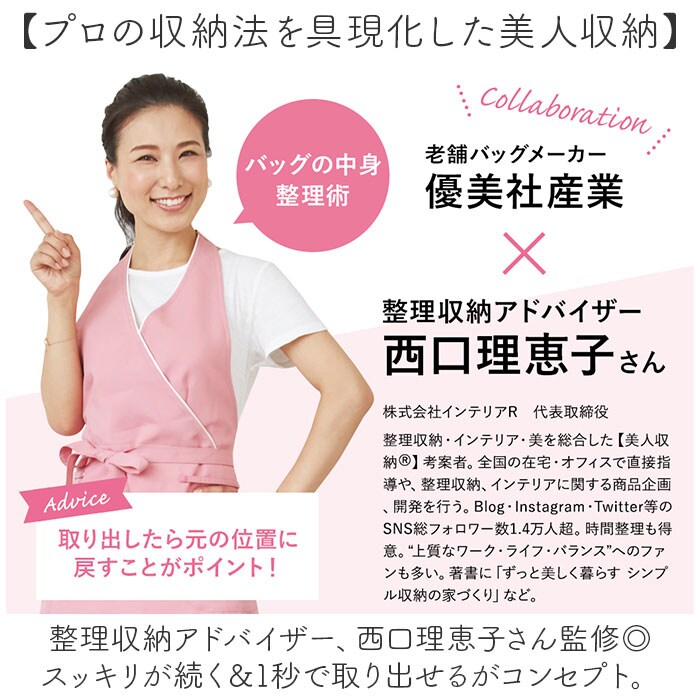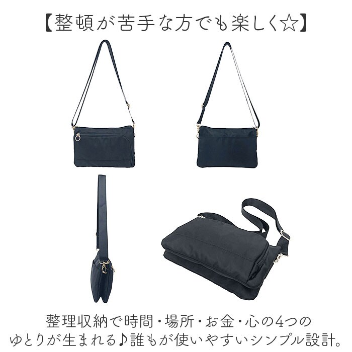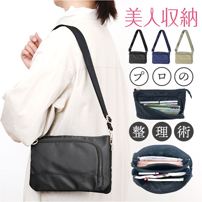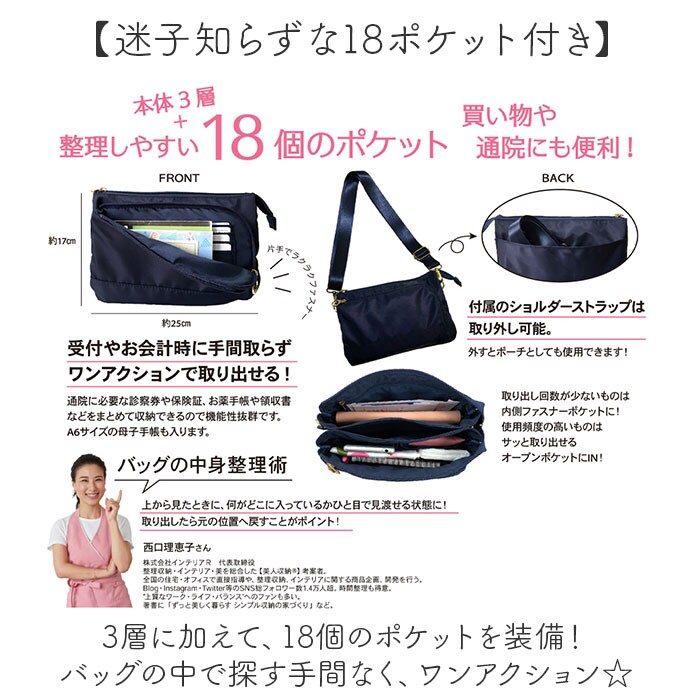 | 商品説明 | 【小物を見やすくすっきり整理整頓】充実のポケット仕様◎シンプルながら機能性に優れた「美人収納 多機能3層ショルダーバッグ」【プロの収納法を具現化した美人収納】整理収納アドバイザー、西口理恵子さん監修◎スッキリが続く&1秒で取り出せるがコンセプト。【受付やお会計時も手間取らない!】通院に必要な保険証や診察券、A6の母子手帳。お買い物時に使うカード類を見やすくIN。【開閉スムーズ、安心の天ファスナー】ガバっと開いて取り出しやすく、ファスナーを閉じれば中身の飛び出しをガード。【3層構造でカンタン収納上手】内側には3つの収納スペース。何がどこに入っているか見渡しやすく、取り出したら元の位置に。【迷子知らずな18ポケット付き】・3層に加えて、18個のポケットを装備!バッグの中で探す手間なく、ワンアクション☆【自分仕様にアレンジできて便利】使用頻度の高い物はオープンポケット。取り出す回数が少ない物は内側ファスナーポケットに。【サッと持ち出せる心強い相棒】ショルダーの長さを調節して、肩掛けや斜め掛け。スマートに持ち運べるサイズ感。【ポーチとしても活用できて便利】ショルダーを外して、バッグインもOK。旅行など長距離のお出かけ時にも活躍。【お手入れも簡単なナイロン素材】バッグ本体は、ガシガシ使える丈夫な素材。汚れが気になったら、サッと拭き取るだけ。【コーデに馴染むベーシックカラー】どんなお洋服とも合わせやすく、飽きのこないカラーをラインナップ。シーンも問わず重宝。【整頓が苦手な方でも楽しく☆】整理収納で時間・場所・お金・心の4つのゆとりが生まれる♪誰もが使いやすいシンプル設計。【ポケット仕様】前面側スペース:オープンポケット×5、メッシュポケット×2背面側スペース:ファスナーポケット×1前面:L字ファスナー式ポケット×1(内側にカードポケット×8)背面:マグネットポケット×1 |