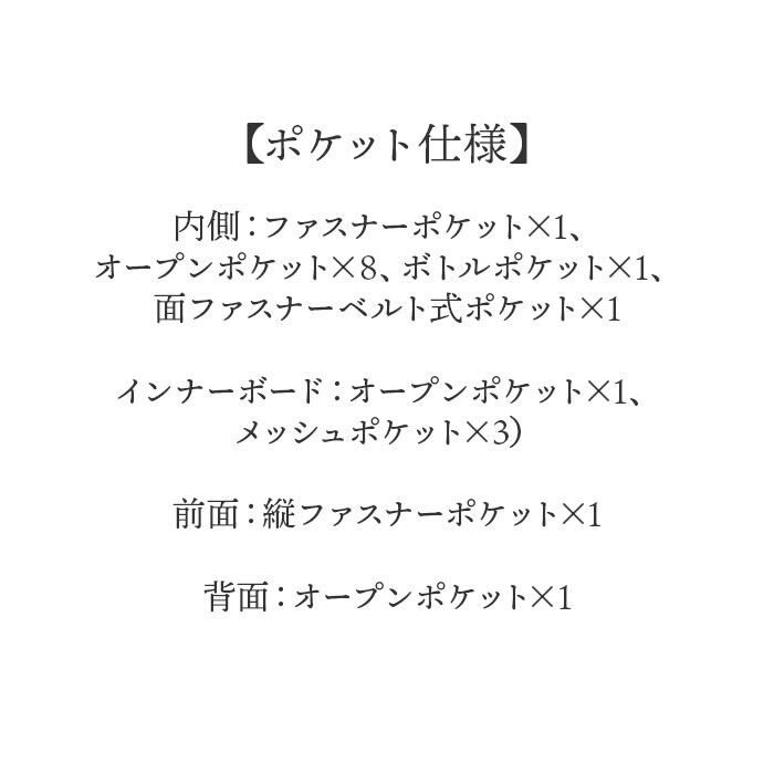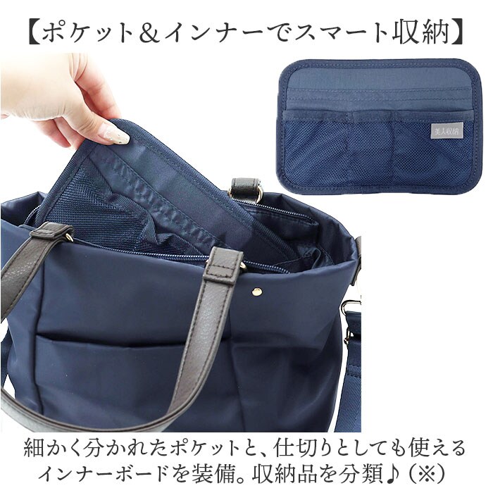 | 商品説明 | 【小物を見やすくすっきり整理整頓】充実のポケット仕様◎シンプルで使いやすい「美人収納 2WAYバッグ」。【プロの収納法を具現化した美人収納】整理収納アドバイザー、西口理恵子さん監修◎スッキリが続く&1秒で取り出せるがコンセプト。【お好みに合わせてスタイルチェンジ】ハンドバッグとして!長さ調節可能なショルダーを取り付け肩掛けや斜め掛けも自在な2WAY☆【開閉スムーズ、安心の天ファスナー】ガバっと開いて取り出しやすく、ファスナーを閉じれば中身の飛び出しをガード。【A5対応で小物をひとまとめ】A5がすっぽり、長財布やポーチも収まるサイズ。ソフトな底材内蔵で、安定性もキープ◎【縦向き収納でワンアクション】小物を一目で確認できて、探す手間が不要。必要な物にサクッとアクセス&元の位置へ戻せる!【ポケット&インナーでスマート収納】細かく分かれたポケットと、仕切りとしても使えるインナーボードを装備。収納品を分類♪(※)インナーボードのブランドネーム裏に、お名前スペース付きです。【自分仕様にアレンジできて便利】使用頻度の高い物はオープンポケット。取り出す回数が少ない物は内側ファスナーポケットに。【お手入れも簡単なナイロン素材】バッグ本体は、ガシガシ使える丈夫な素材。汚れが気になったら、サッと拭き取るだけ。【コーデに馴染むベーシックカラー】どんなお洋服とも合わせやすく、飽きのこないカラーをラインナップ。シーンも問わず重宝。【整頓が苦手な方でも楽しく☆】整理収納で時間・場所・お金・心の4つのゆとりが生まれる♪誰もが使いやすいシンプル設計。【ポケット仕様】内側:ファスナーポケット×1、オープンポケット×8、ボトルポケット×1、面ファスナーベルト式ポケット×1インナーボード:オープンポケット×1、メッシュポケット×3)前面:縦ファスナーポケット×1背面:オープンポケット×1 |