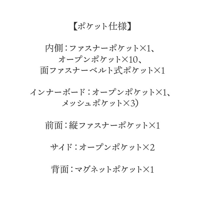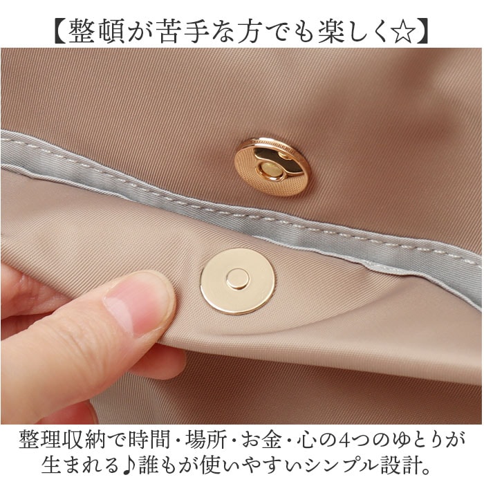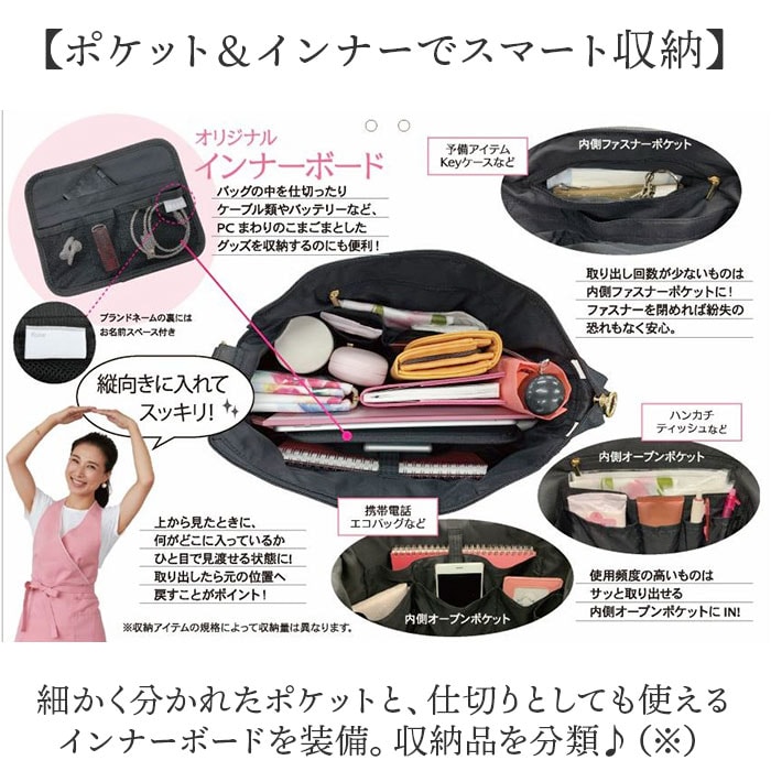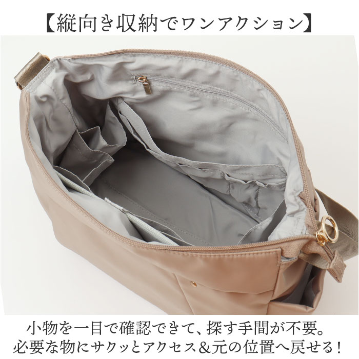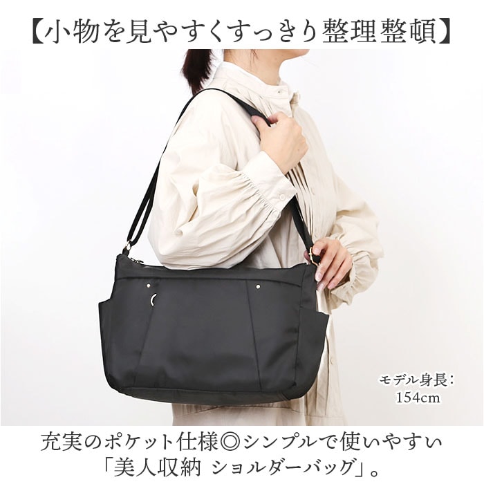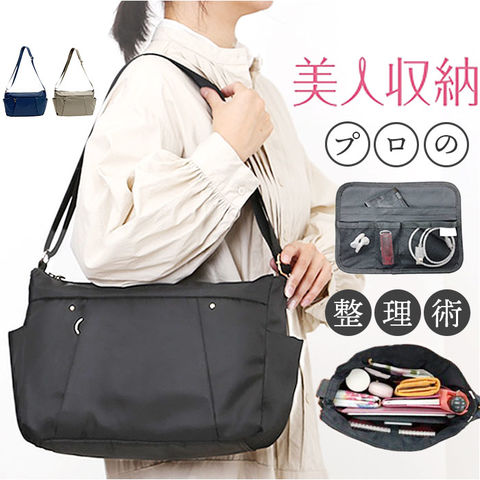 | 商品説明 | 【小物を見やすくすっきり整理整頓】充実のポケット仕様◎シンプルで使いやすい「美人収納 ショルダーバッグ」。【プロの収納法を具現化した美人収納】整理収納アドバイザー、西口理恵子さん監修◎スッキリが続く&1秒で取り出せるがコンセプト。【両手が空いて移動がラクラク】ショルダーの長さを調節して、肩掛けや斜め掛け。アクティブシーンでも快適。【開閉スムーズ、安心の天ファスナー】ガバっと開いて取り出しやすく、ファスナーを閉じれば中身の飛び出しをガード。【B5対応で小物をひとまとめ】B5がすっぽり、長財布やポーチも収まるサイズ。ソフトな底材内蔵で、安定性もキープ◎【縦向き収納でワンアクション】小物を一目で確認できて、探す手間が不要。必要な物にサクッとアクセス&元の位置へ戻せる!【ポケット&インナーでスマート収納】細かく分かれたポケットと、仕切りとしても使えるインナーボードを装備。収納品を分類♪(※)インナーボードのブランドネーム裏に、お名前スペース付きです。【自分仕様にアレンジできて便利】使用頻度の高い物はオープンポケット。取り出す回数が少ない物は内側ファスナーポケットに。【お手入れも簡単なナイロン素材】バッグ本体は、ガシガシ使える丈夫な素材。汚れが気になったら、サッと拭き取るだけ。【コーデに馴染むベーシックカラー】どんなお洋服とも合わせやすく、飽きのこないカラーをラインナップ。シーンも問わず重宝。【整頓が苦手な方でも楽しく☆】整理収納で時間・場所・お金・心の4つのゆとりが生まれる♪誰もが使いやすいシンプル設計。【ポケット仕様】内側:ファスナーポケット×1、オープンポケット×10、面ファスナーベルト式ポケット×1インナーボード:オープンポケット×1、メッシュポケット×3)前面:縦ファスナーポケット×1サイド:オープンポケット×2背面:マグネットポケット×1 |