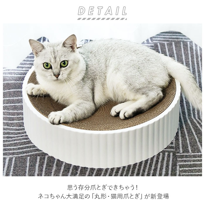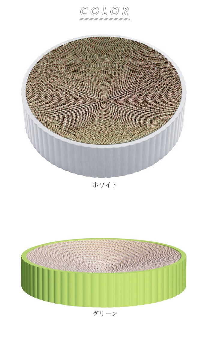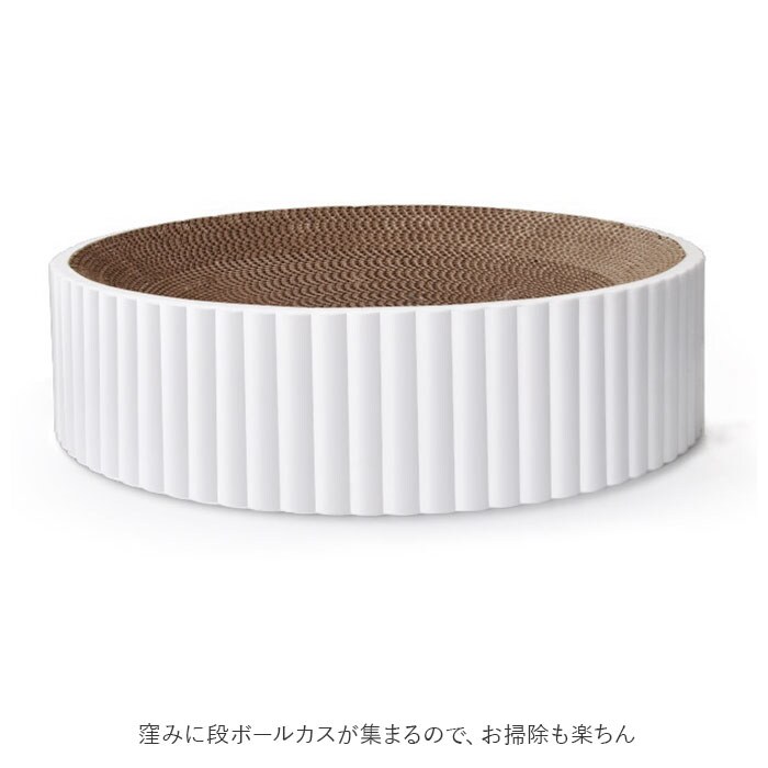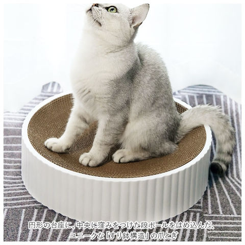 | 商品説明 | 思う存分爪とぎできちゃう!ネコちゃん大満足の「丸形・猫用爪とぎ」が新登場。円形の台座に、中央に窪みをつけた段ボールをはめ込んだ、ユニークな「すり鉢構造」の爪とぎ。爪とぎの後の段ボールカスが少ない、良質な段ボール素材を採用。窪みに段ボールカスが集まるので、お掃除も楽ちん。爪とぎの習慣をつけることで、家具やソファでの爪とぎを防止して、ストレス解消にも♪ネコちゃんが身体を丸めて寝転ぶのにちょうどよいなだらかなカーブ形状で、猫用ベッドとしても大活躍!シンプルなホワイトの台座がお部屋の雰囲気に素敵にマッチ。棒タイプの段ボール爪とぎよりもお洒落さがUP! |