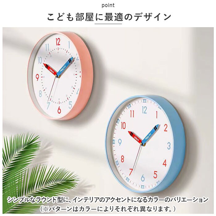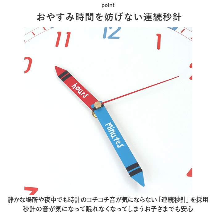 | 商品説明 | カラフルで可愛い知育時計が登場♪【お子様でも見やすい文字盤】カラフルにデザインされた文字盤で、時間の感覚を直観的に学習できる知育時計。【おやすみ時間を妨げない連続秒針】静かな場所や夜中でも時計のコチコチ音が気にならない「連続秒針」を採用。秒針の音が気になって眠れなくなってしまうお子さまでも安心。【こども部屋に最適のデザイン】シンプルなラウンド型に、インテリアのアクセントになるカラーのバリエーション。(※パターンはカラーによりそれぞれ異なります。)単三電池1本使用。(※テスト用電池1本付属) |