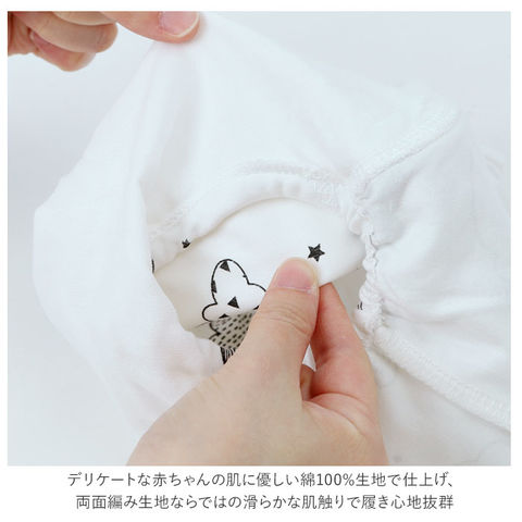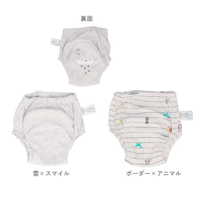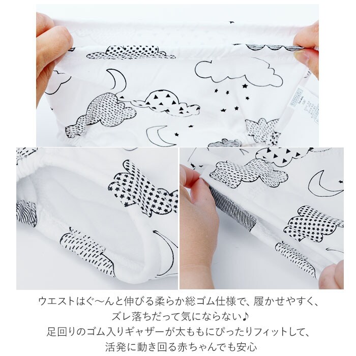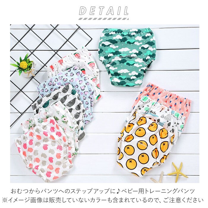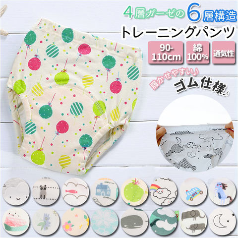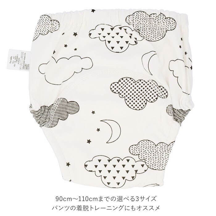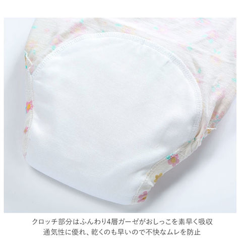 | 商品説明 | おむつからパンツへのステップアップに♪ベビー用トレーニングパンツ。デリケートな赤ちゃんの肌に優しい綿100%生地で仕上げ、両面編み生地ならではの滑らかな肌触りで履き心地抜群。クロッチ部分はふんわり4層ガーゼがおしっこを素早く吸収。通気性に優れ、乾くのも早いので不快なムレを防止。ウエストはぐ~んと伸びる柔らか総ゴム仕様で、履かせやすく、ズレ落ちだって気にならない♪足回りのゴム入りギャザーが太ももにぴったりフィットして、活発に動き回る赤ちゃんでも安心。ポップで可愛らしい柄のお気に入りパンツで、楽しくトイレトレーニング♪90cm~110cmまでの選べる3サイズ。パンツの着脱トレーニングにもオススメ。 |
