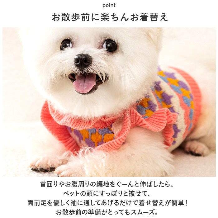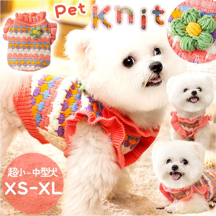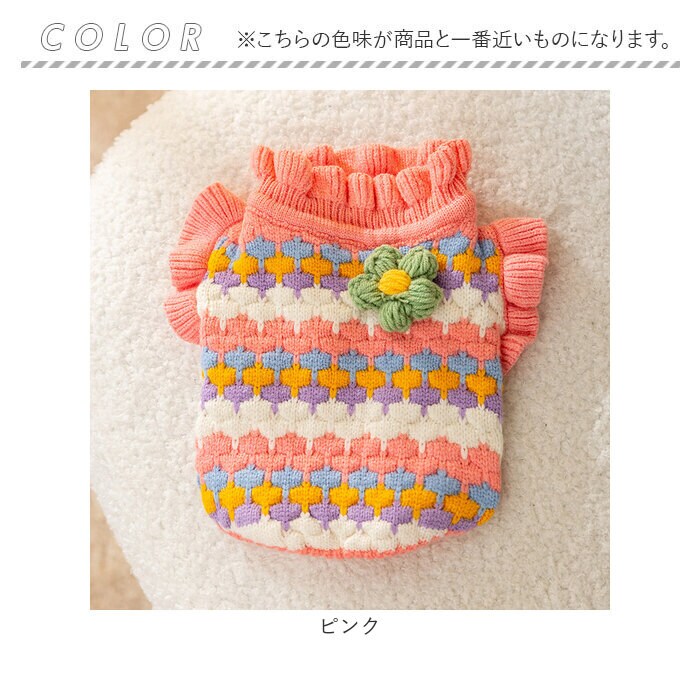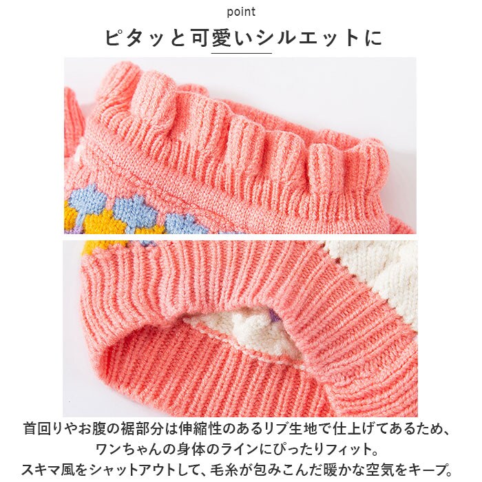 | 商品説明 | 飼い主さんとのお出掛けは、カラフルニットで秋冬コーデ!華やかで優しい色合いがパッと目を惹く「ペット用ニット」が新登場。【ふんわり着せて、優しく防寒】細めの毛糸をざっくりと編みこんで仕上げた、ワンちゃん・ネコちゃんも着用できるふんわりニットセーター。厚すぎず薄すぎない、肌寒い季節にサッと着せてあげられる程よい厚みの生地感がポイント!【お散歩前に楽ちんお着替え】首回りやお腹周りの編地をぐーんと伸ばしたら、ペットの頭にすっぽりと被せて、両前足を優しく袖に通してあげるだけで着せ替えが簡単!お散歩前の準備がとってもスムーズ。【ピタッと可愛いシルエットに】首回りやお腹の裾部分は伸縮性のあるリブ生地で仕上げてあるため、ワンちゃんの身体のラインにぴったりフィット。スキマ風をシャットアウトして、毛糸が包みこんだ暖かな空気をキープ。【おトイレ楽ちん・ゆったり設計】ワンちゃんがおトイレする時にもたつかない♪お腹周りやお尻が大きく開いたゆったりデザイン。【超小型~中型犬にぴったり】XSサイズからXLサイズまでの5つのサイズから、ぴったりサイズがチョイス可能!超小型犬から、胴回り50cm程度までの中型犬に最適なサイズ感。小さなサイズはネコちゃんにもオススメ。【ご家庭で簡単お洗濯♪】セーターやニットのように、オシャレ着用洗剤で優しく手洗いすれば、ご家庭でお洗濯が可能!こまめにお手入れしていつでも清潔。(※必ず手洗いでお手入れしてください。ドライクリーニングはご利用いただけません。)【おしゃまな女の子にオススメ】ピンクを基調に、くすみカラーの編地をブロック状に積み重ねたデザインがおしゃまな女の子にぴったり!背中にちょこんと乗ったコサージュのような立体的なお花と、フリルのように波打たせた袖リブがチャームポイント。【ルームウェアにも◎】肌寒さが気になる季節のお散歩用ウェアとしてはもちろん、ルームウェアやパジャマとして、朝晩の冷え込み対策にもオススメ。 |