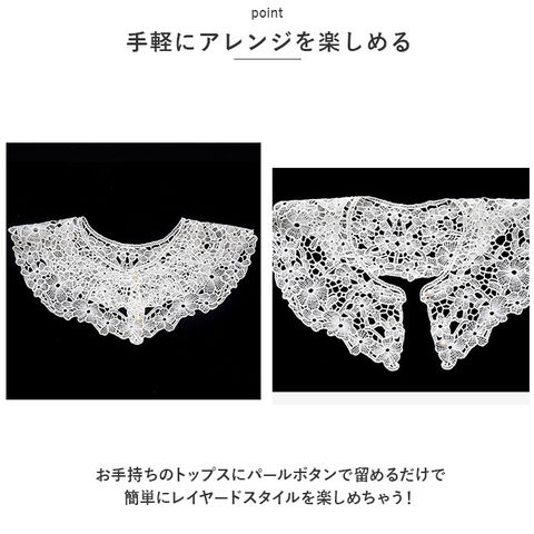 | 商品説明 | いつもの服がワンランクアップ!レース付け襟が発売。【手軽にアレンジを楽しめる】お手持ちのトップスにパールボタンで留めるだけで簡単にレイヤードスタイルを楽しめちゃう!【肌見えを抑える◎】胸元の開いた服に合わせて隠したいところを上品にカバー。華やかなレース素材で女性らしい雰囲気に。【オールシーズン活躍】襟元だけのタイプなので、着ぶくれの心配不要。シーズンレスで使え、シンプルなアイテムのアレンジに活躍。 |