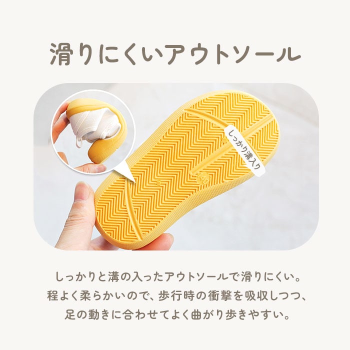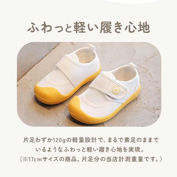 | 商品説明 | スクールスタイルの足元に、ほんのり自分色をプラス♪控えめなくすみカラーが可愛い「キッズ用スクールシューズ(上履き)」が新登場。【キッズの足に優しいつくり】程よいクッション性のあるインソールと、厚みのある合成ゴムのフットベッドがキッズの足裏にかかる衝撃や負担を優しく軽減。【かる~い履き心地】片足わずか120gの軽量設計で、まるで素足のままでいるようなふわっと軽い履き心地を実現。(※17cmサイズの商品、片足分の当店計測重量です。)【丸いカタチがつま先をガード】アウトソール先端は、つま先部分を包み込むように丸みのあるフォルムに仕上げ、うっかりつま先をぶつけてしまっても痛くない安心仕様。【スポッと履けて、脱げにくい!】混雑する学校の昇降口でもスポッと履ける!面ファスナーベルトが足の甲にぴったりとフィットして、脱ぎ履きスムーズ。【滑りにくいアウトソール】細かい凹凸を刻んだアウトソールが、フラットなフロアーや階段でもしっかりとグリップするから、活発なキッズでも安心。【抜群の動きやすさ】屈曲性に優れたアウトソールは動きやすさも抜群。軽くて動きやすいため、体育館での運動やダンスのような習い事にも大活躍!【お手入れ簡単、いつでも清潔】インソールは取り外しができるので、手軽に水洗いができていつでも清潔さをキープ。【キッズも大満足の大人カラー】学年カラーのオーソドックスな上履きでは満足できないお洒落キッズに最適。くすみカラーのソールと「LOVE FOR MY BABY」のサークルロゴが印象的なアクセント。(※一部くすみカラーではないカラーの商品もございます。) |